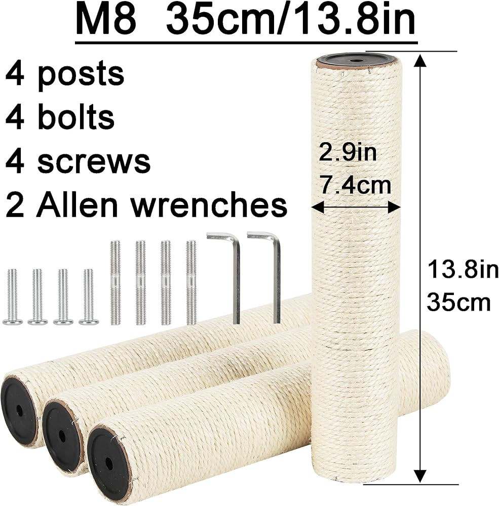 عمود خدش القطط مناسب للبراغي التي يبلغ قطرها 8 مم (M8). إذا كانت شجرة قطتك أو عمود الخدش الخاص بك يستخدم هذا النوع من البراغي، فيمكنك اختيار أعمدة الاستبدال الخاصة بنا.