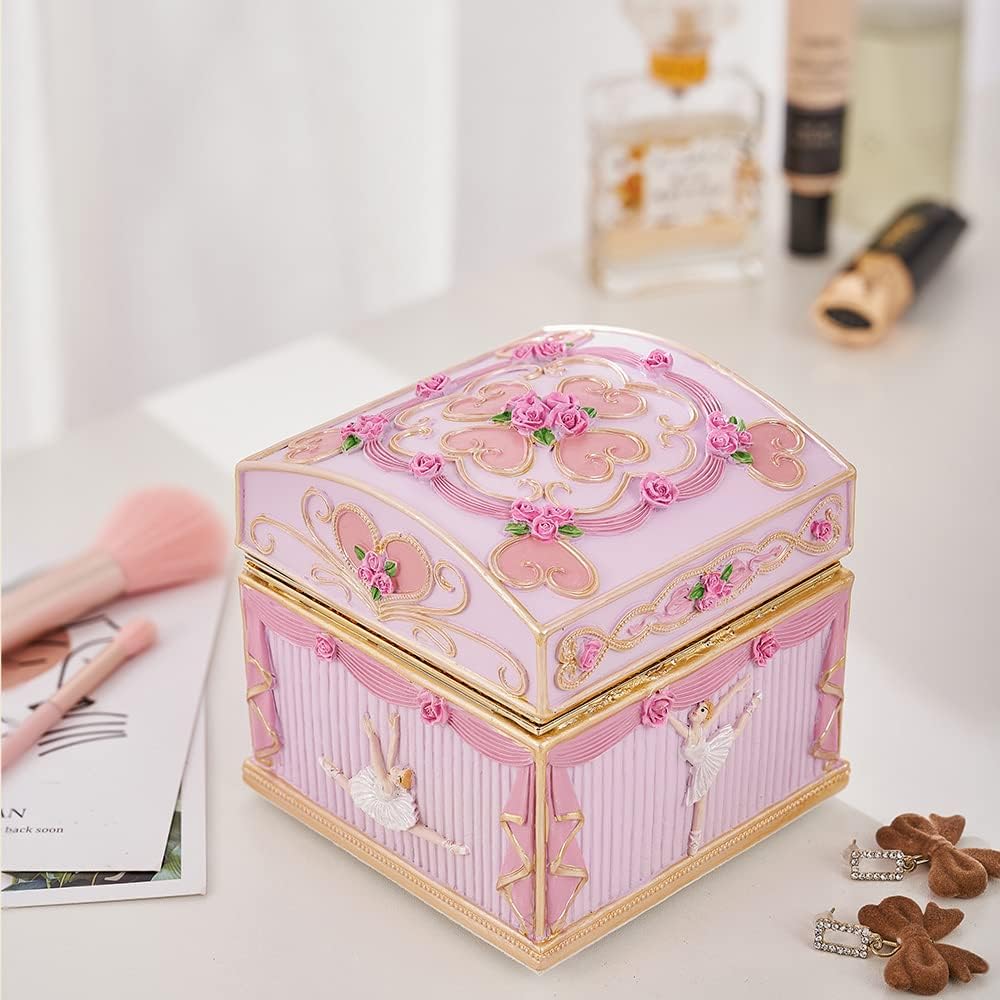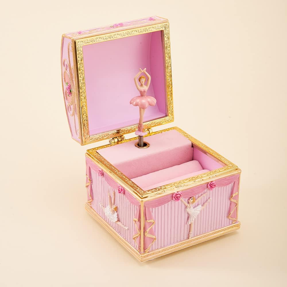 تصميم دائري أنيق: صندوق الموسيقى هذا المصمم بشكل معقد مستوحى من الدوار الكلاسيكي، مع حصان متوضع برشاقة يدور مع الموسيقى. إنها مزينة بزخارف ذهبية رقيقة وألواح وردية فاتحة اللون، مما يجعلها قطعة ساحرة تأسر بجوهرها الخيالي.