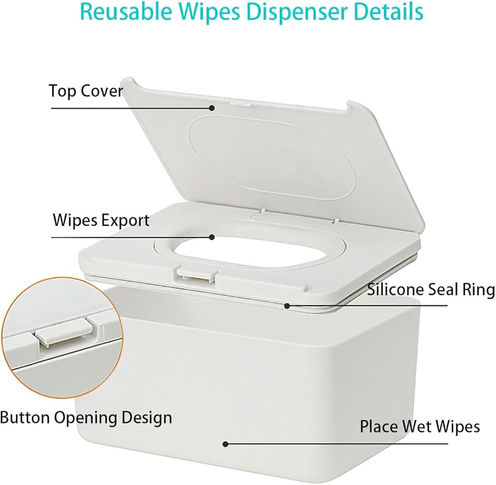 【فتح بيد واحدة مع زر】موزع صندوق المناديل المبللة هذا هو تغيير قواعد اللعبة، مما يجعل استخدام مناديل الأطفال المبللة أسهل بكثير. إذا كان لديك طفل صغير يحاول الهروب أثناء تغيير الحفاض، وتحتاج إلى يد لحمله وأخرى للمسح... تتيح لك هذه الحاوية استخدام يد واحدة للإمساك بالمناديل المبللة لأن الغطاء المصمم بفتحة الزر سهل الاستخدام. فتح وإغلاق، تعمل بيد واحدة فقط. يبقى في مكانه ويسمح بتوزيع منديل واحد في كل مرة. وداعًا لمناديل الأطفال البلاستيكية المزعجة ذات الصوت المجعد!