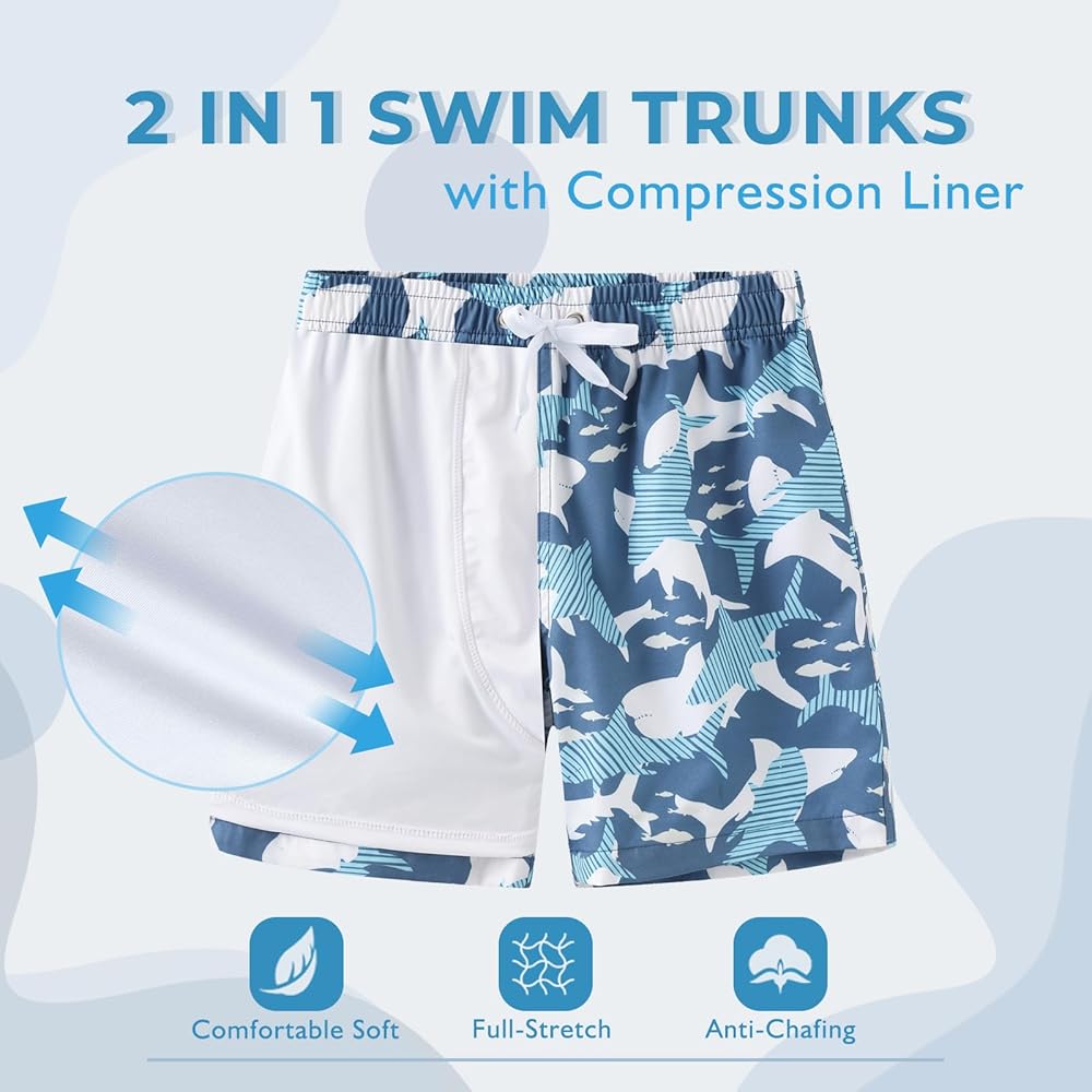 • »»»» PREMIUM FABRIC QUALITY «««« Made of high quality polyester blended fabrics, our boys swim trunks with compression liner are durable and soft for flexible movements with its great elasticity and durability.