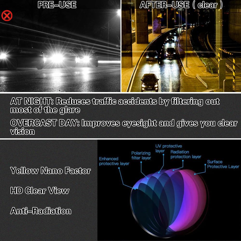 【ENHANCE CONTRAST - MORE CLEAR】Wear on night driving glasses for men women in special weather like cloudy, fog, rainy days or other poor light, enhance brightness and contrast. Night vision glasses for driving, makes your vision clearer