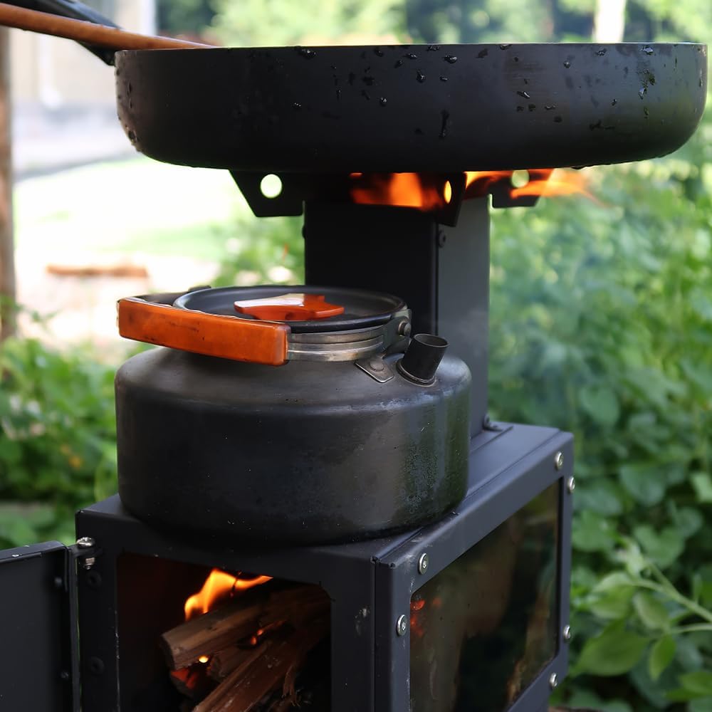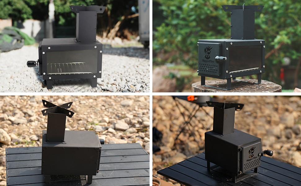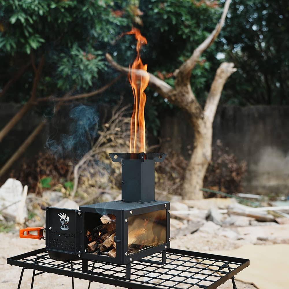 【جودة فائقة】موقد التخييم مصنوع من الفولاذ عالي الجودة. يتميز طلاء المسحوق الأسود بمقاومة عالية للحرارة. وقد تم تجهيز مواقد التخييم الخشبية لدينا بنوافذ كبيرة مقاومة للحرارة على الجانب لرؤية الحرارة ووقت الاحتراق بسهولة. زجاج موقد الخيمة مقاوم للحرارة حتى 700 درجة مئوية.