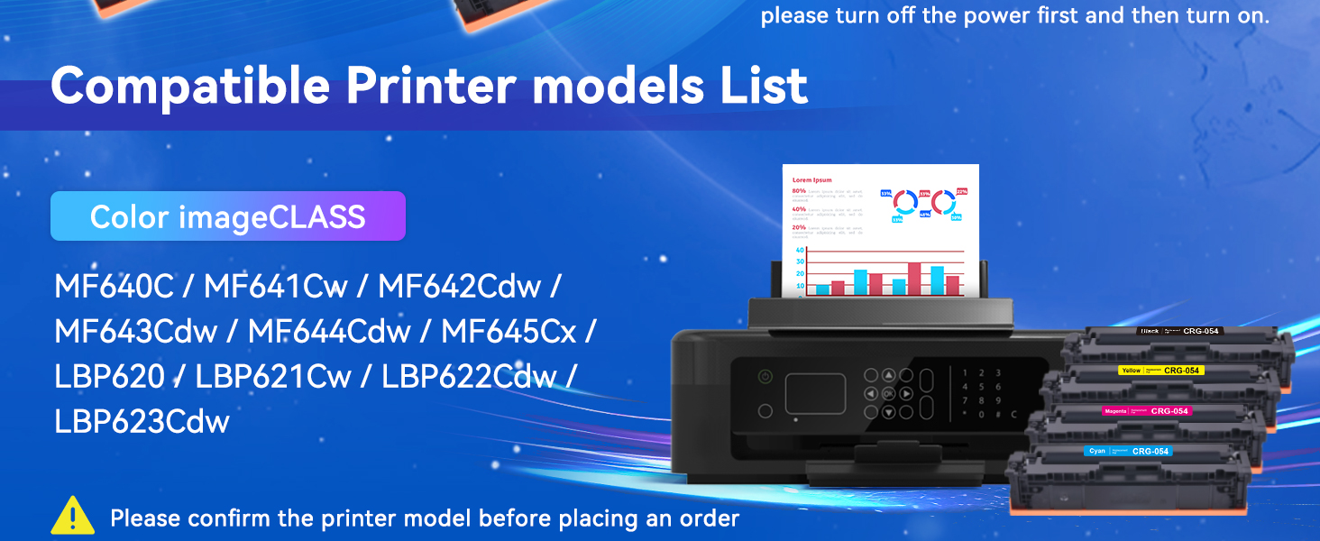 بالنسبة إلى حبر Canon 054، استخدم مع: Color imageCLASS LBP620 / LBP621Cw / LBP622Cdw / LBP623Cdw؛ MF640C / MF641Cw / MF642Cdw / MF643Cdw / MF644Cdw / MF645Cx لمجموعة خرطوشة الحبر Canon 054/054H