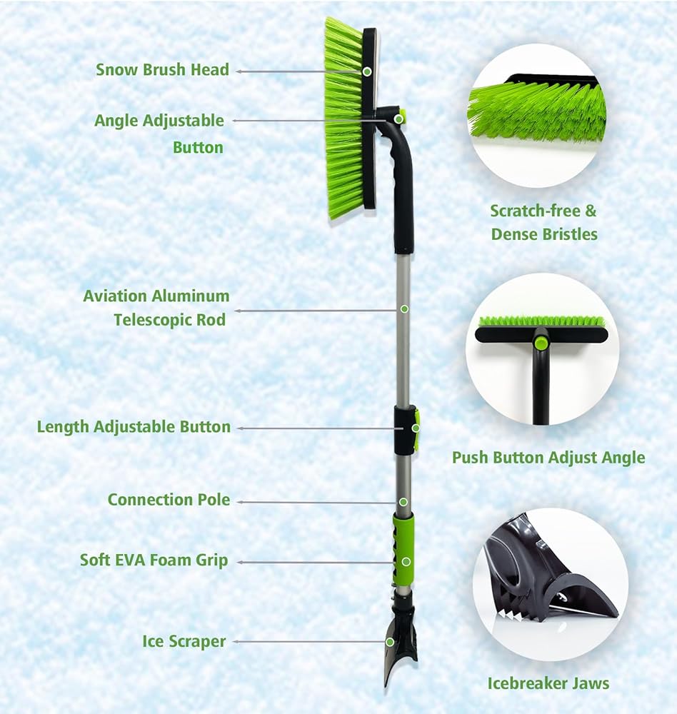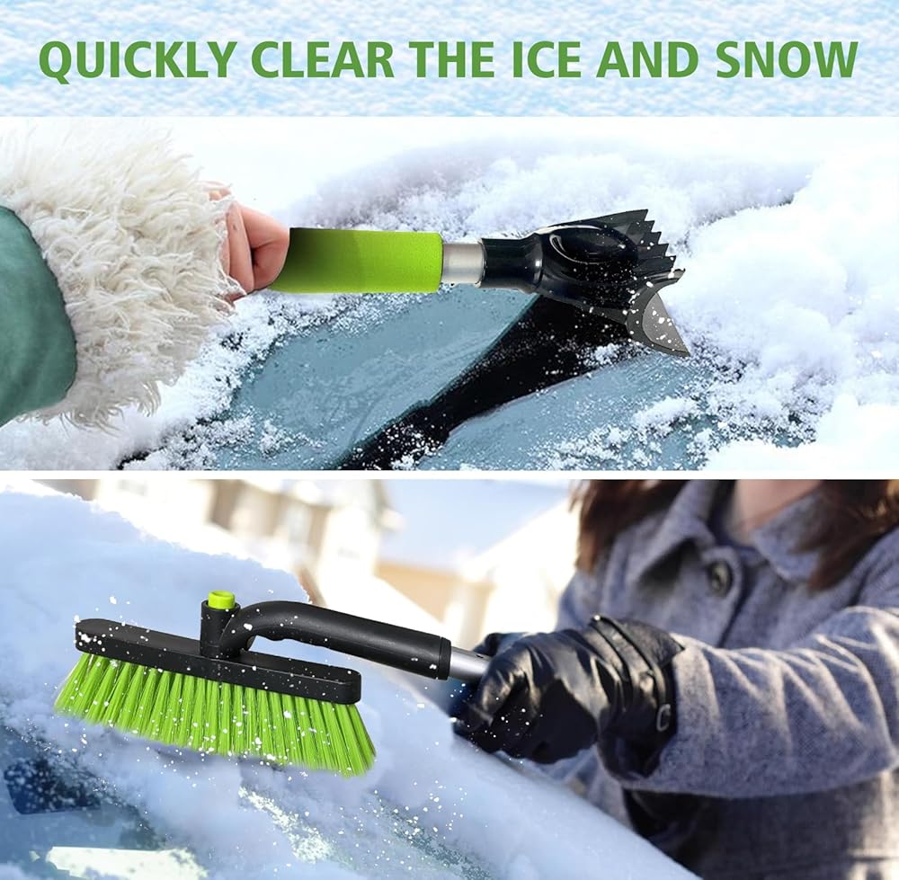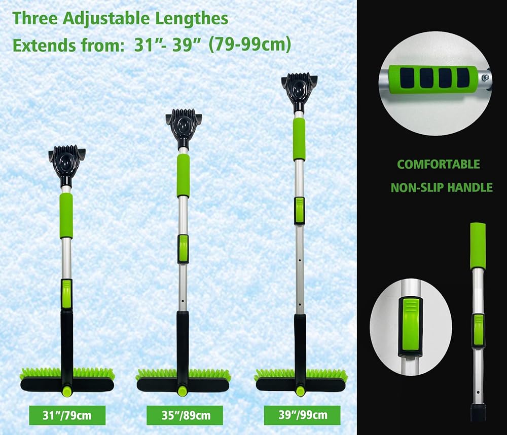 ❄️ Snow scraper with brush extendable can retractable length is 44"-53",360°rotation the brush head can adjust the any angle you need.