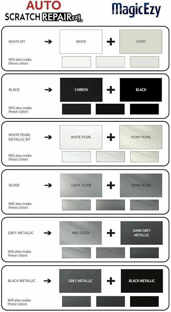 جميع الماركات والنماذج: احصل على تطابق رائع للألوان. مزج الألوان لتناسبها: لا حاجة لاستخدام أقلام اللمس المرمزة بالألوان في المصنع والتي غالبًا لا تتطابق مع الطلاء الباهت. ما عليك سوى مزج الألوان ومطابقة العين للحصول على تطابق مثالي. يصنع ظلال مختلفة من اللؤلؤ الأسود والفضي والرمادي والأبيض والأبيض.