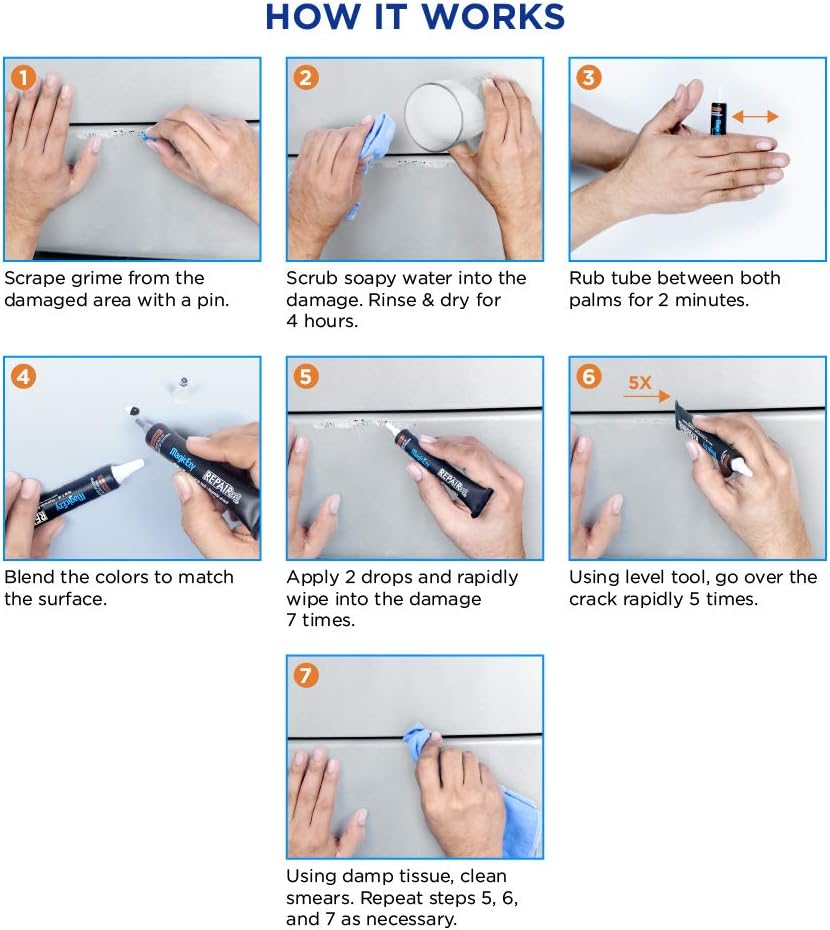 سهل الاستخدام. قلم طلاء من جزء واحد يعمل على إصلاح الرقائق والخدوش. ما عليك سوى تنظيف السطح وتطبيقه وتسويته ومسح الفائض. لا حاجة للتحضير أو الصنفرة.