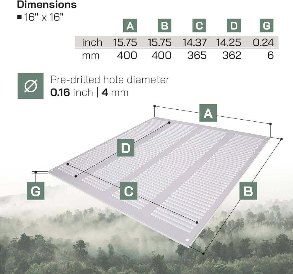 غطاء فتحة تهوية باللون البني مقاس 16 × 16 بوصة. الأبعاد بين فتحات المسامير - 15.20 بوصة × 15.08 بوصة. صالحة للاستخدام على حد سواء - في الداخل والخارج. غطاء فتحة تهوية الهواء النقي سهل التركيب - غطاء الشواية.