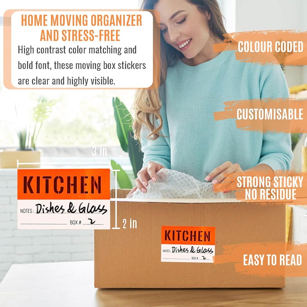 • Bright Colors - Use color-coded box inventory labels stickers to organizer your boxes and help the moving process go smoothly and easy!Our moving box labels indicate what inventory is in each box and what room it belongs to!