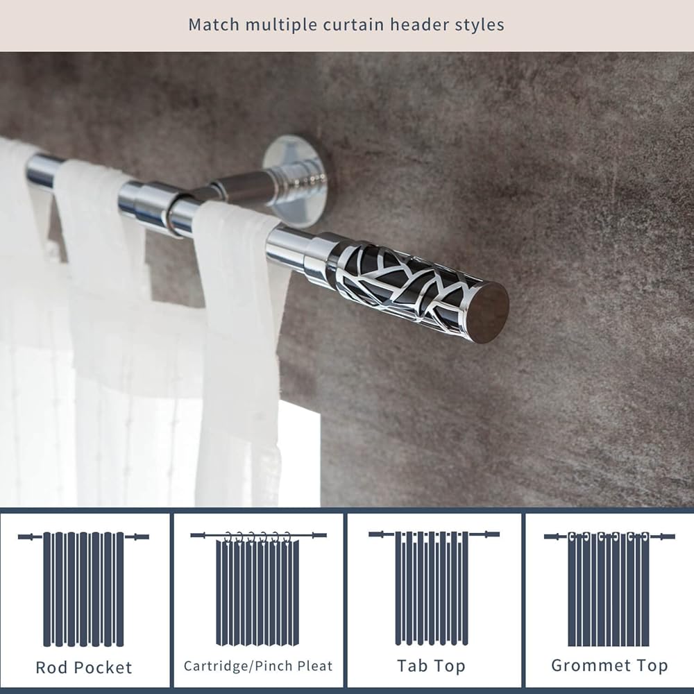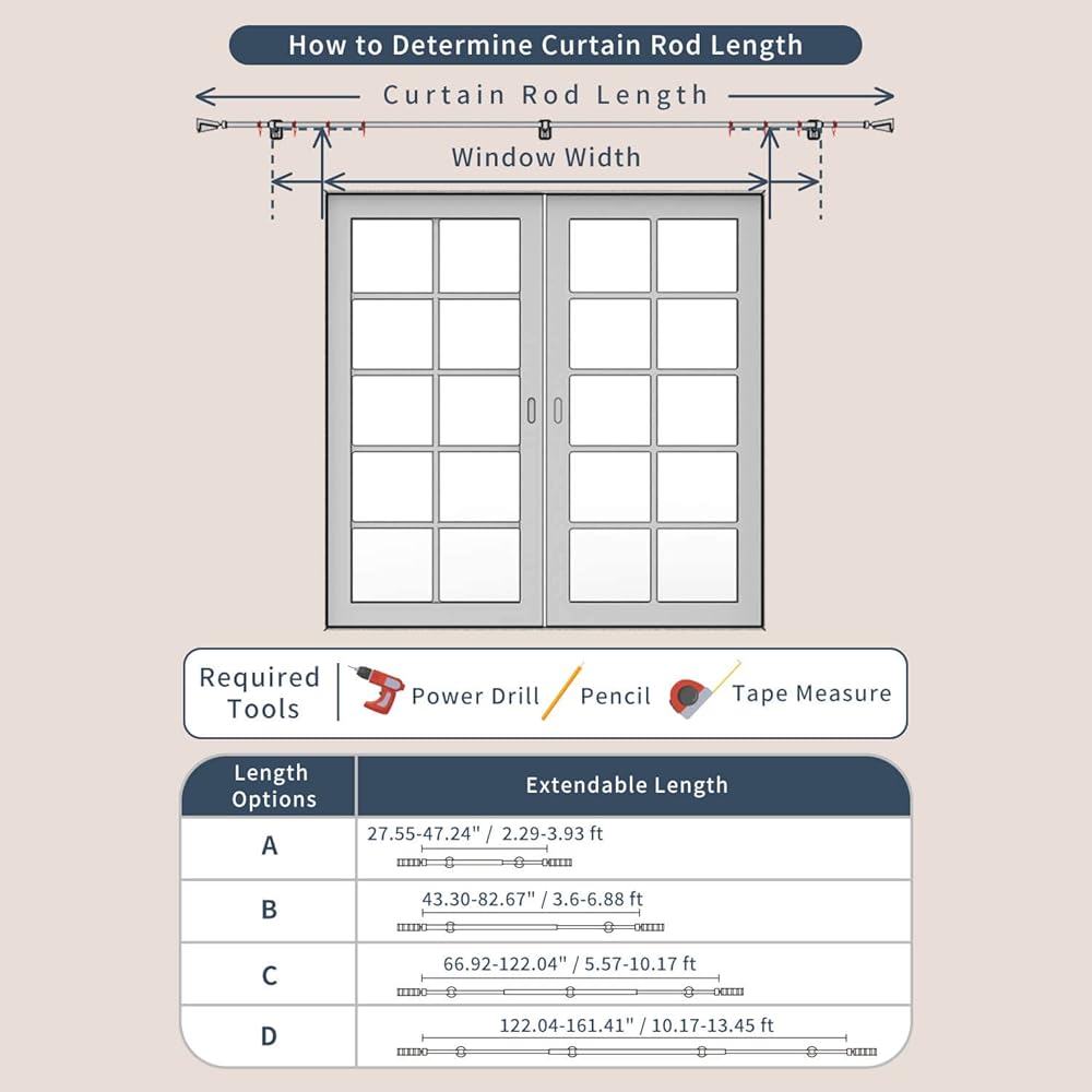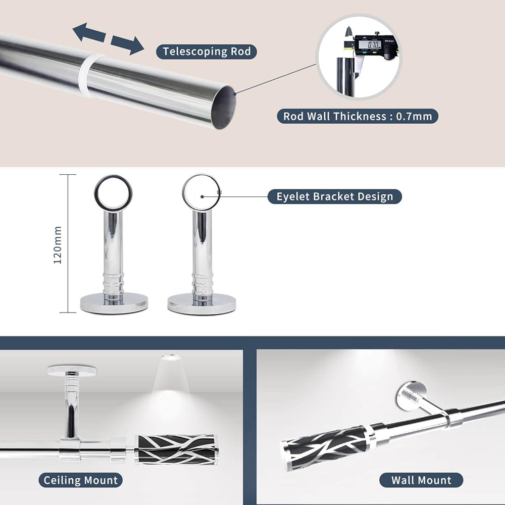 قضيب ستارة قابل للتعديل: الهيكل المتداخل لقضيب الستارة يجعل طوله قابلاً للتعديل من 66 إلى 120 بوصة. إنها قادرة على التوافق مع العديد من أنواع النوافذ المختلفة وأنماط رأس الستارة المتنوعة، بما في ذلك Rod Pocket وCartridge/Pinch Pleat وTab Top وGromet Top وأكثر من ذلك.