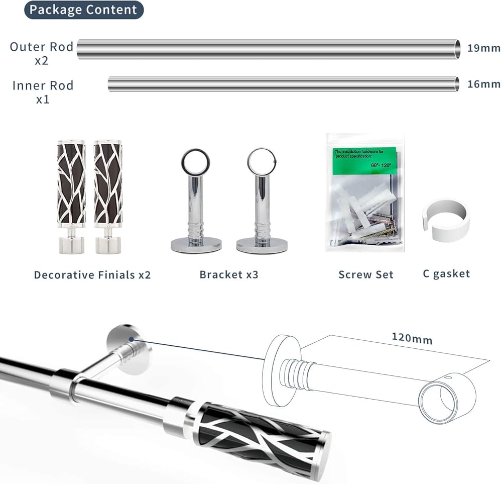 محتوى العبوة: تتضمن مجموعة قضبان الستارة 3 قضبان ستارة، و3 دعامات تثبيت، وقطعتين نهائيتين، وحشية واحدة C، وجميع الأجهزة اللازمة للتركيب.