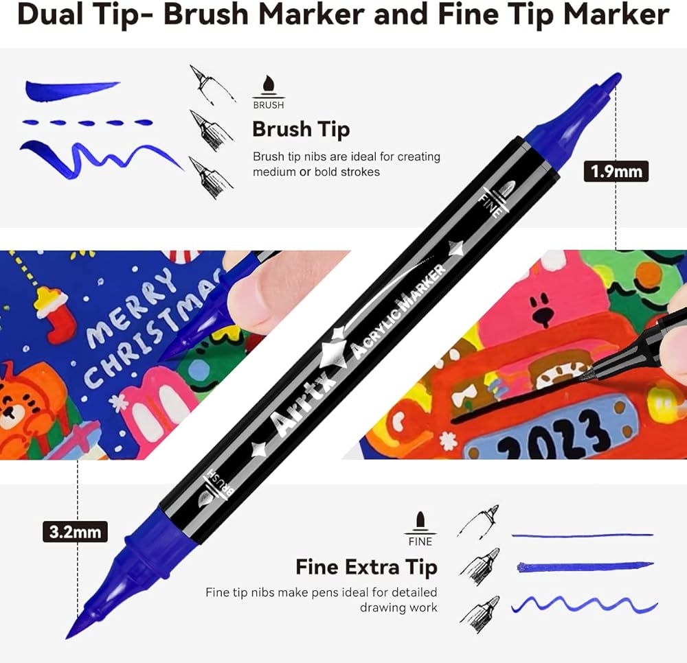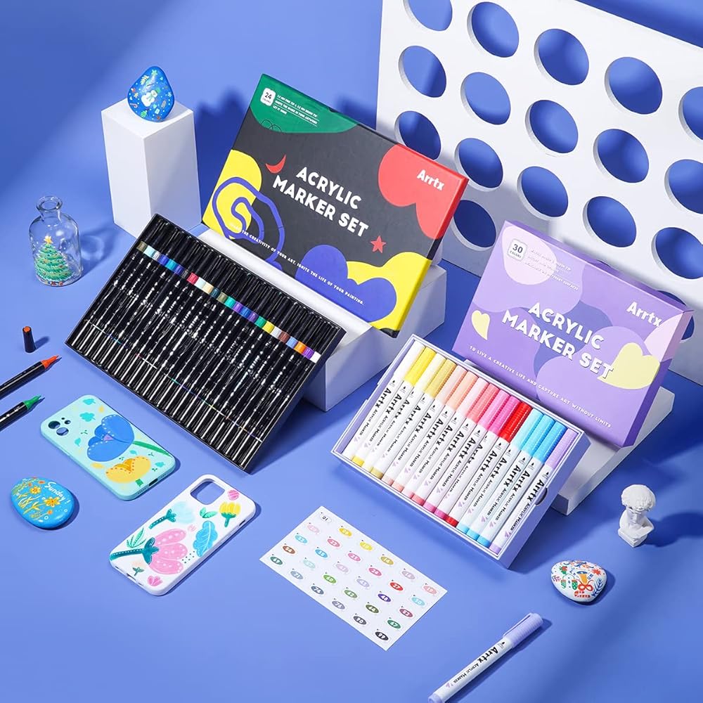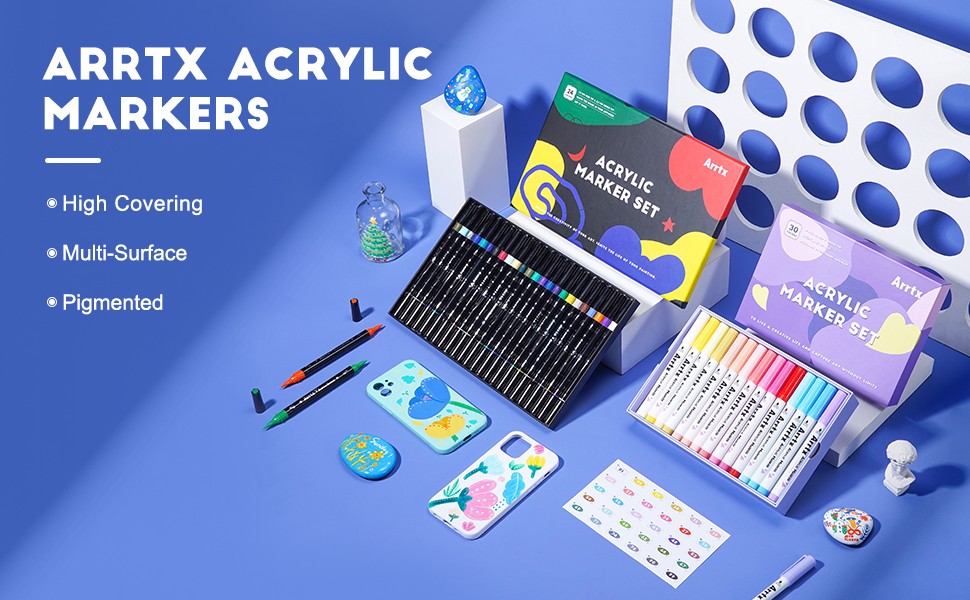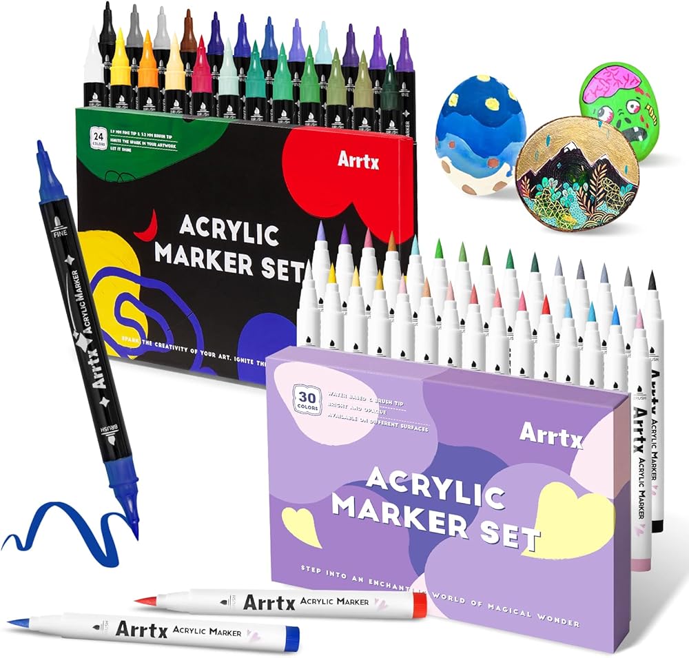 🎨[ما الذي يمكنك الحصول عليه؟ ] يمكنك الحصول على صندوقين من أقلام التحديد الأكريليك، صندوق واحد يحتوي على 24 قطعة يأتي مع رأس فرشاة ورأس رفيع، رؤوس فرشاة مقاس 3.2 مم مثالية لإنشاء ضربات متوسطة أو جريئة، سنون ذات أطراف دقيقة مقاس 1.9 مم تجعل الأقلام مثالية لأعمال الرسم التفصيلية، مثالية للرسم على الأسطح الخشنة. الصندوق الآخر يحتوي على 30 قطعة من رأس الفرشاة، الطلاء ذو الصبغة العالية ذو تغطية عالية، وهو مقاوم للماء ومقاوم للتآكل مما يسمح بوضعه على أي سطح تقريبًا.
