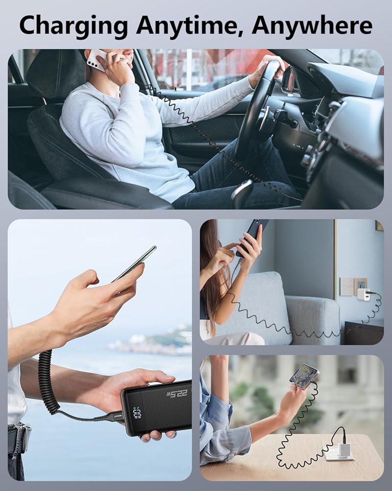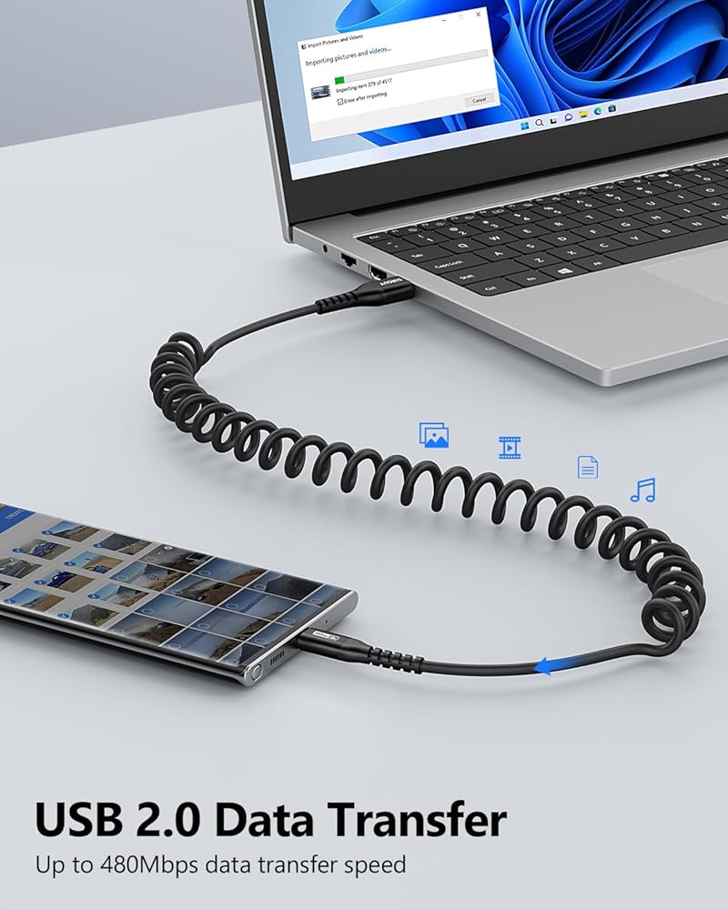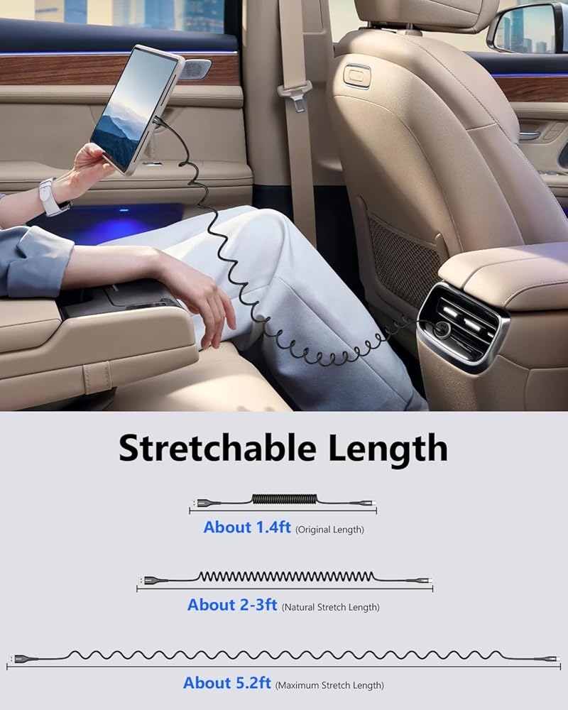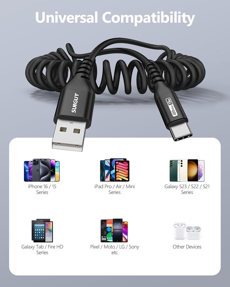 ✅[كابل USB C ملفوف] تم تصميم كابل شاحن USB C ملفوف من SUNGUY بزنبرك قابل للسحب، بدون تشابك، بدون عقدة، سهل التمدد، بدون مجهود، سريع الارتداد، ولا يتشوه بسهولة.
