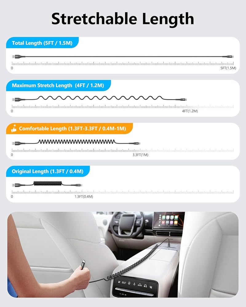 كابل USB C ملفوف من SUNGUY، كابل USB-C بطول 3 أقدام للسيارة، كابل USB إلى USB C Android Auto Carplay، لهاتف iPhone 15/15Pro/15Pro Max، لهاتف Galaxy S23 S22