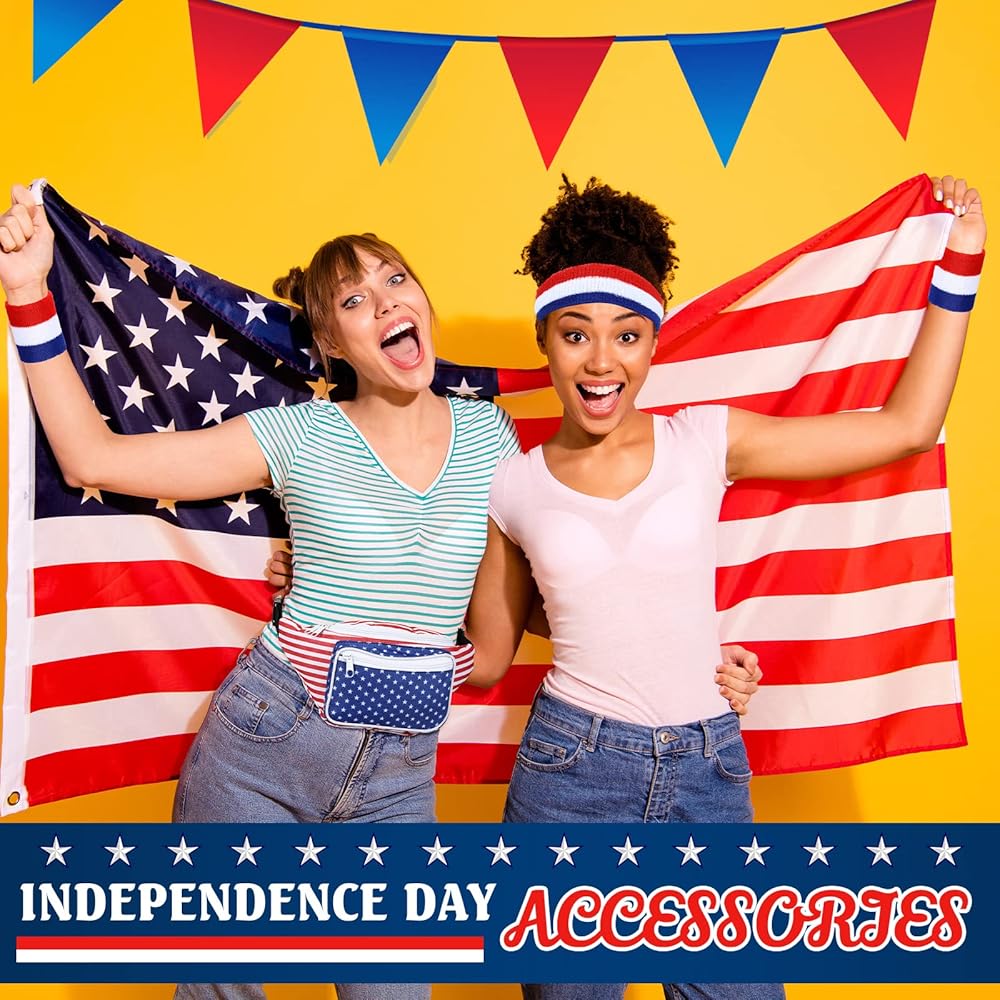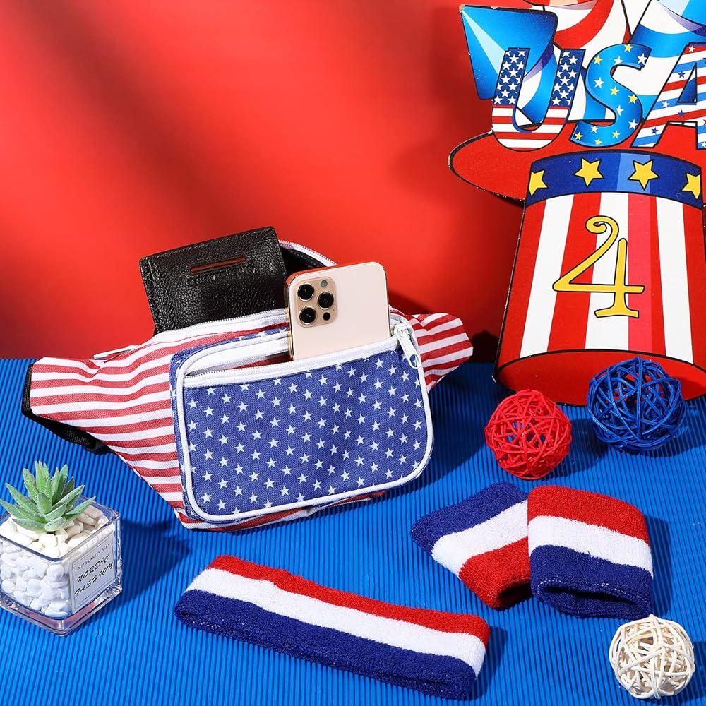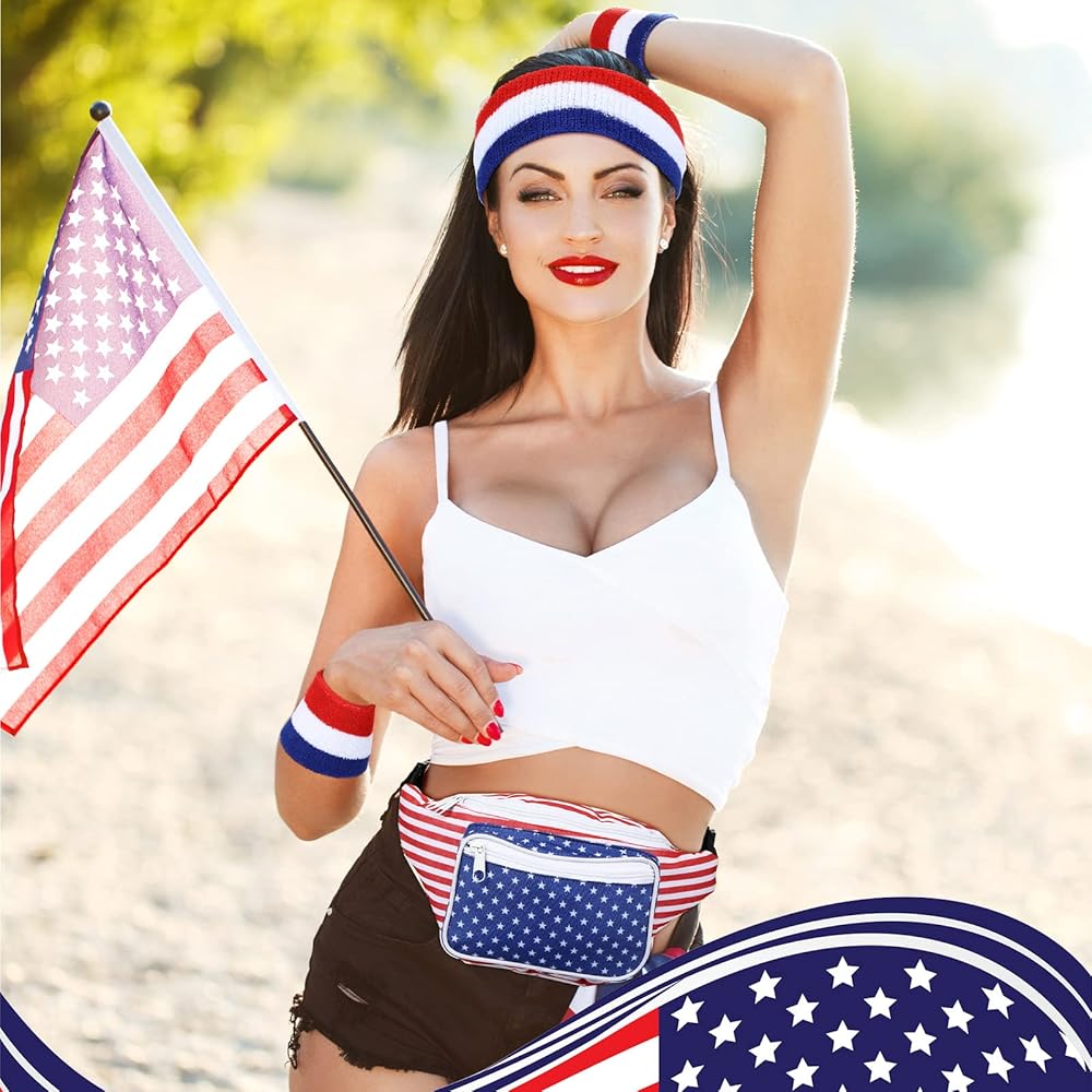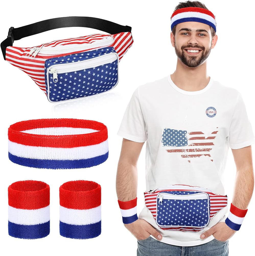 eccliy 4 قطع العلم الأمريكي حزمة فاني مع العصابة الوطنية وأساور المعصم 4th من يوليو حقيبة الخصر تيري القماش معصمه 4th من يوليو الملحقات للياقة البدنية الرجال النساء تجريب في الهواء الطلق ممارسة اليوغا