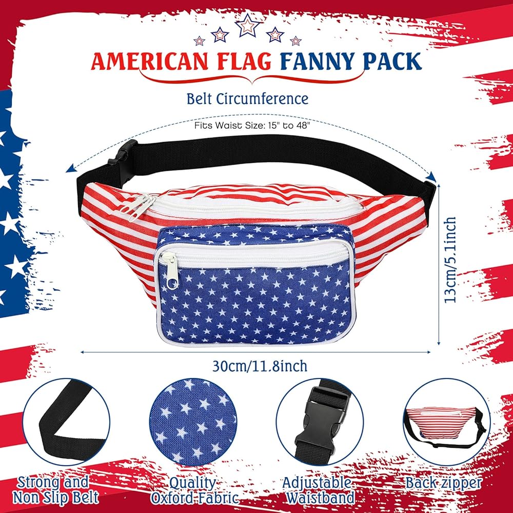 • Reliable and Serviceable: this 4th of July fanny pack is made of canvas, equipped with 2 pieces of zipper pockets and 1 piece of back pocket; It adopts double suture technology and nylon lining, so it is reliable and can provide you with long term use