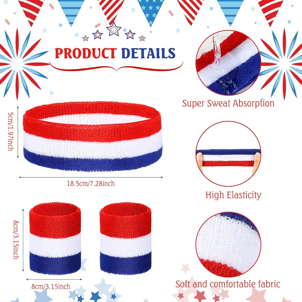 • Classic American Flag Colors: these 80s headband and wristbands adopt the classic American flag colors, namely red, white and blue; These American flag headband and wristband are made of polyester, soft, breathable, sweat absorbing and elastic, so they can fit your wrist and head well; Wearing them can not only preserve your joints when you exercise, but also reflect your love for America; The size of the headband is 7.28 x 1.97 inches/ 18.49 x 5 cm, and the size of the wristband is 8 x 8 cm