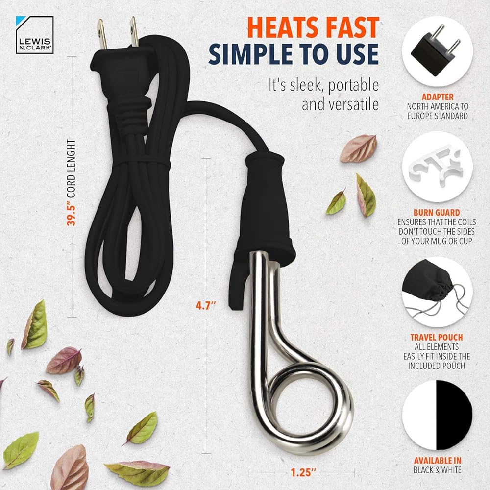 تسخين سريع + سهل الاستخدام: ستحصل على ماء دافئ في ثوانٍ، وغلي الماء في دقائق معدودة. املأ الحاوية الخاصة بك، ضع سخان الغمر في السائل، ثم قم بتشغيل سخان الغمر. الأمر بهذه البساطة.