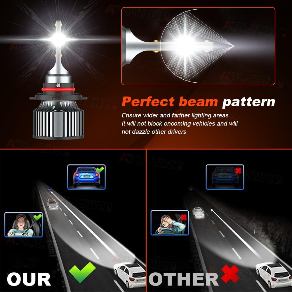 • إضاءة أوسع وأبعد - مجموعة مصابيح الرأس APLJZHZQ مدمجة في أعلى 3570 شريحة CSP، 20,000 لومن لكل زوج. تتميز بإخراج أكثر سطوعًا ونمط شعاع، وتوفر نطاق إضاءة أكبر من الرقائق الأخرى. تسمح لك برؤية أوسع وأبعد، بدون بقعة سوداء أو خافتة، دون عمى المركبات القادمة. رؤية أكثر وضوحًا أثناء القيادة ليلاً، مما يجعل القيادة أكثر أمانًا على الطرق الريفية أو الطرق السريعة.