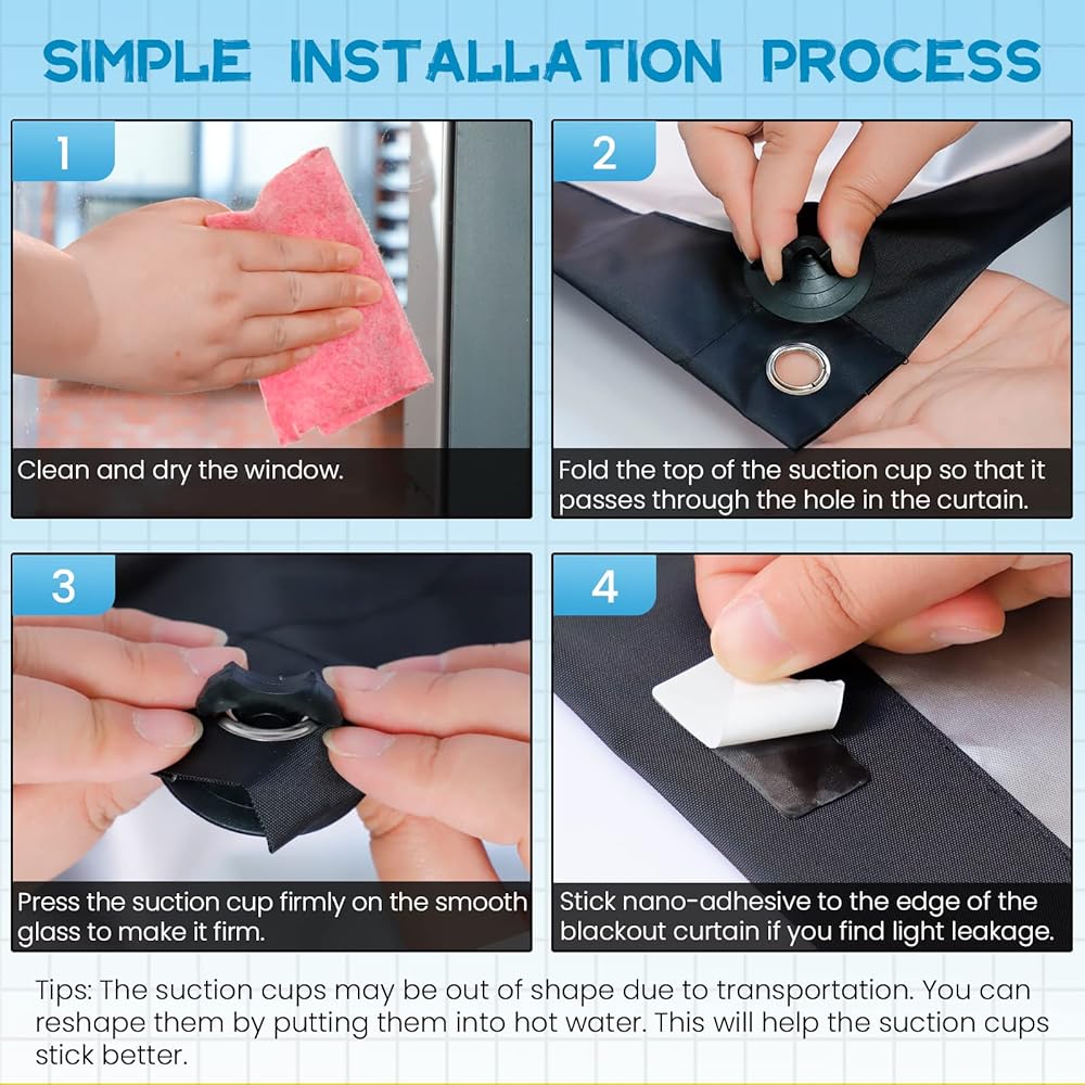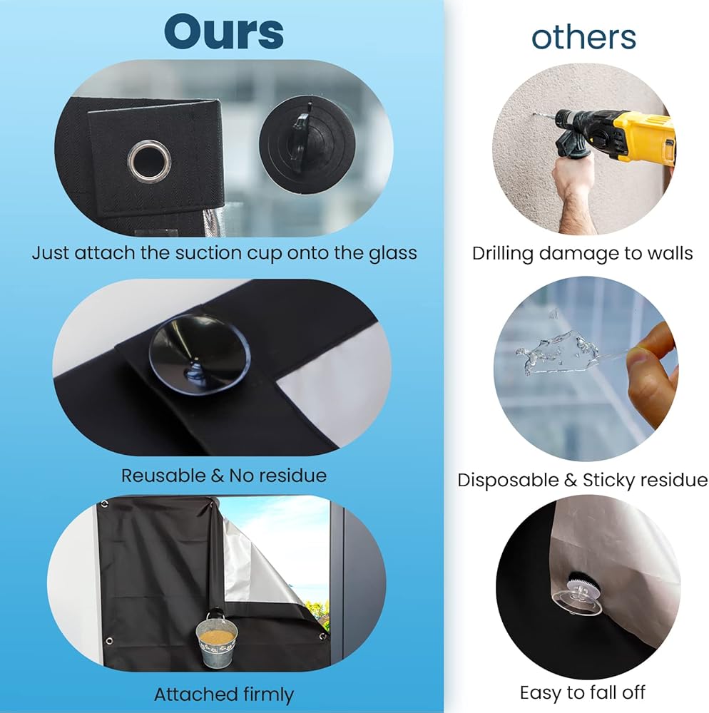 Easy Installation with Suction Cups - Our Blackout Blinds come with 7 suction cups, allowing for hassle-free installation without drilling holes. And if you ever need to remove it, there will be no damage or traces left on the surface.