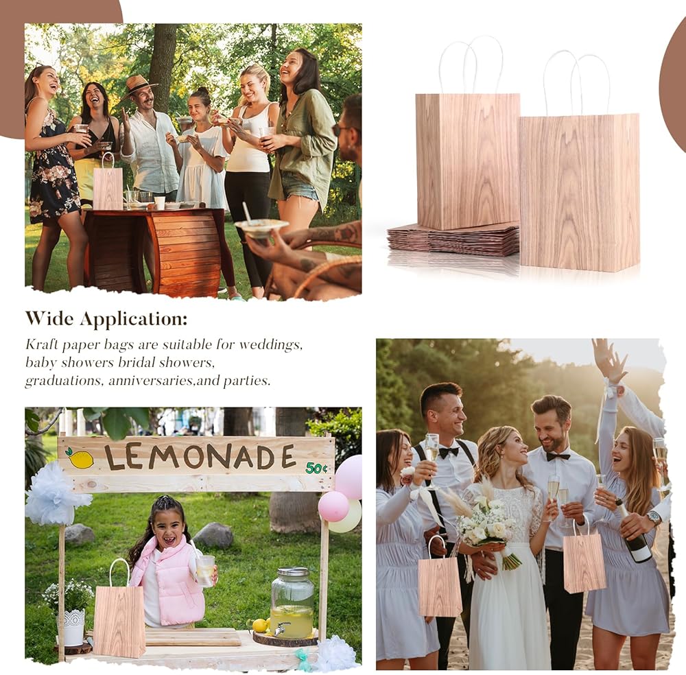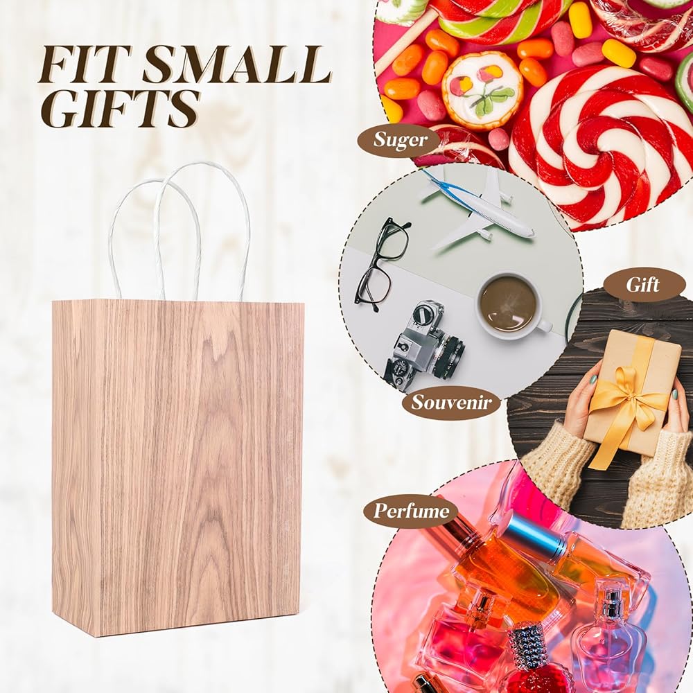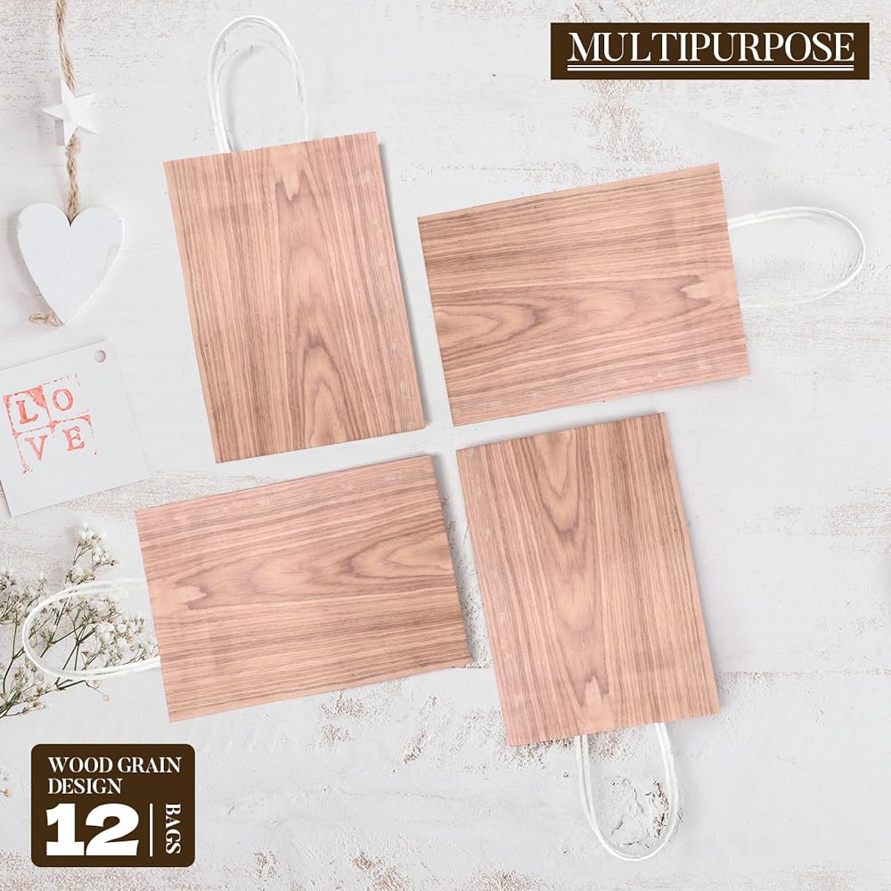12 Pack Brown Kraft Paper Bags with Handles Wood Grain Party Supplies Bulk Gift Bags Party Baby Candy Bag Paper for Birthday Party Wedding