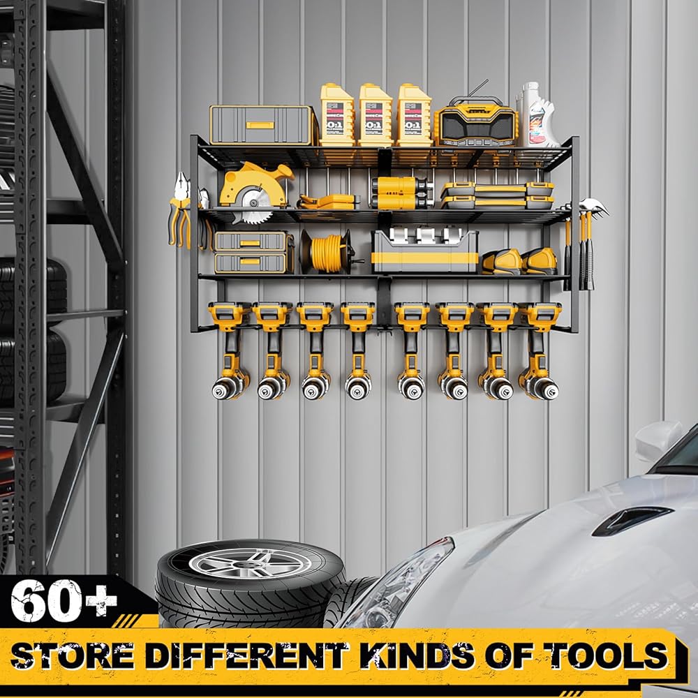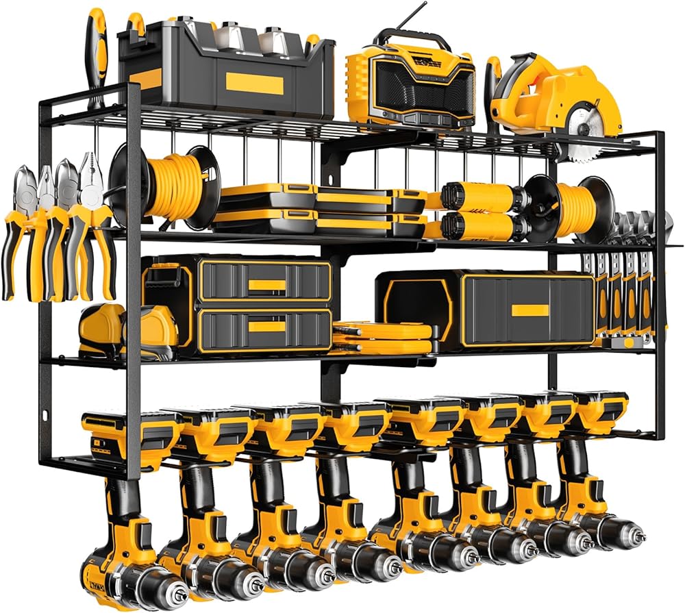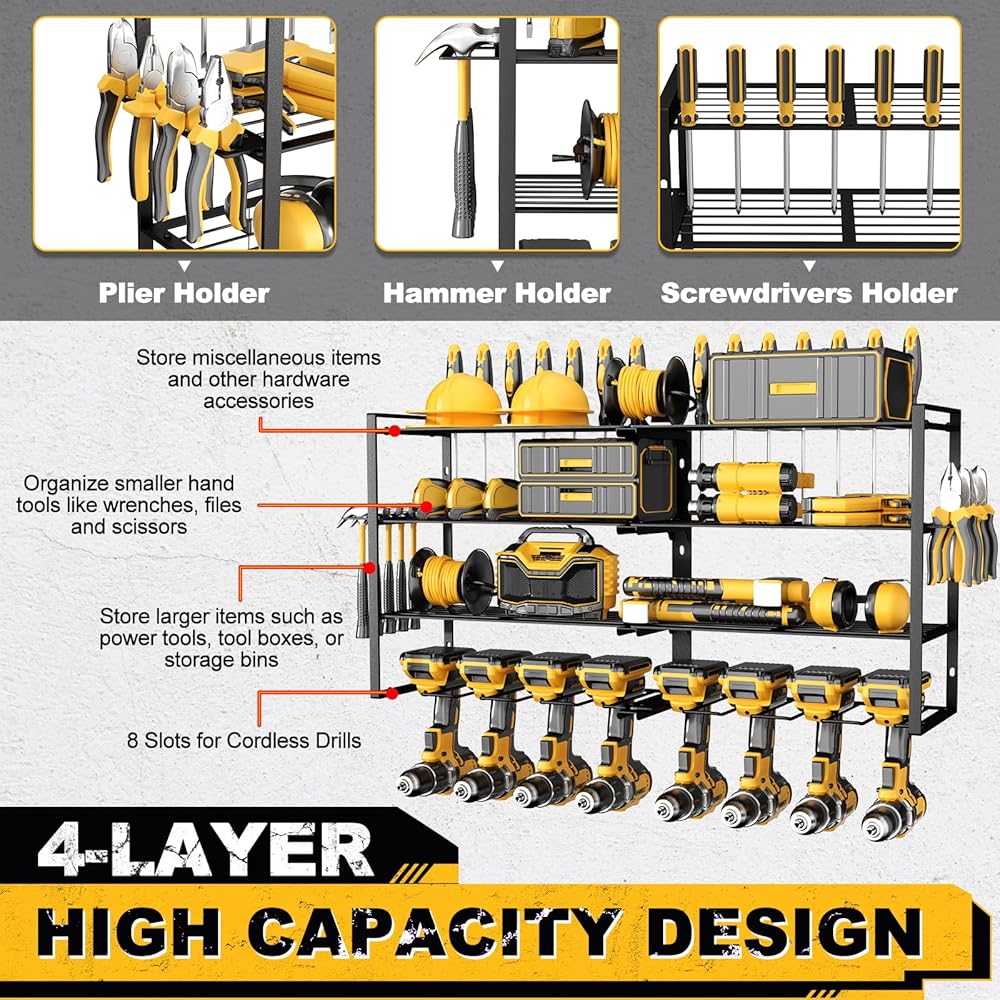 Ronlap منظم أدوات الطاقة على الحائط، 8 حامل مثقاب على الحائط 4 طبقات منظمات الأدوات ورف التخزين لتنظيم المرآب رف منظم الأدوات اللاسلكي مع مفك براغي وحامل مطرقة