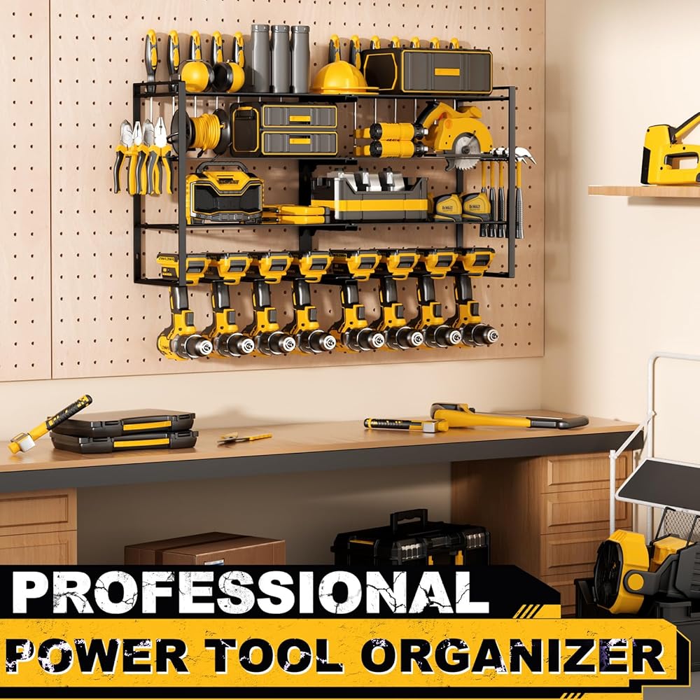 • 【حوامل مثقاب كبيرة للغاية وتصميم ذو 4 طبقات ذات سعة عالية】: حامل الحائط المنظم لأدوات الطاقة هذا هو تصميم عالي السعة من أربع طبقات. يمكن للطبقة السفلية أن تحمل ثمانية مثقاب لاسلكي، ويمكن للطبقات الثلاثة العلوية أن تحمل أدوات ثقيلة أخرى أو مجموعة متنوعة من الأدوات الصغيرة، وتم إضافة حامل مطرقة وحامل كماشة وحامل مفك براغي إلى الجانب.