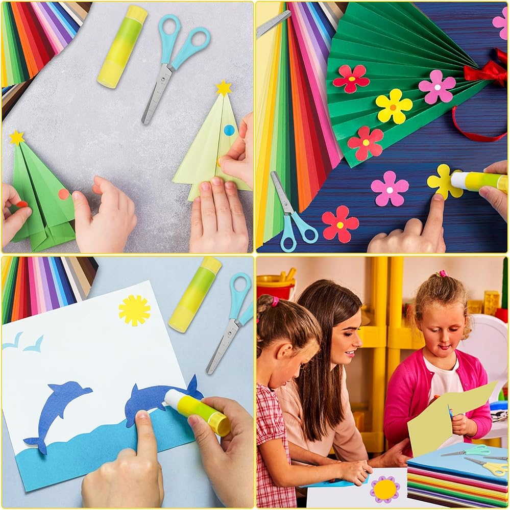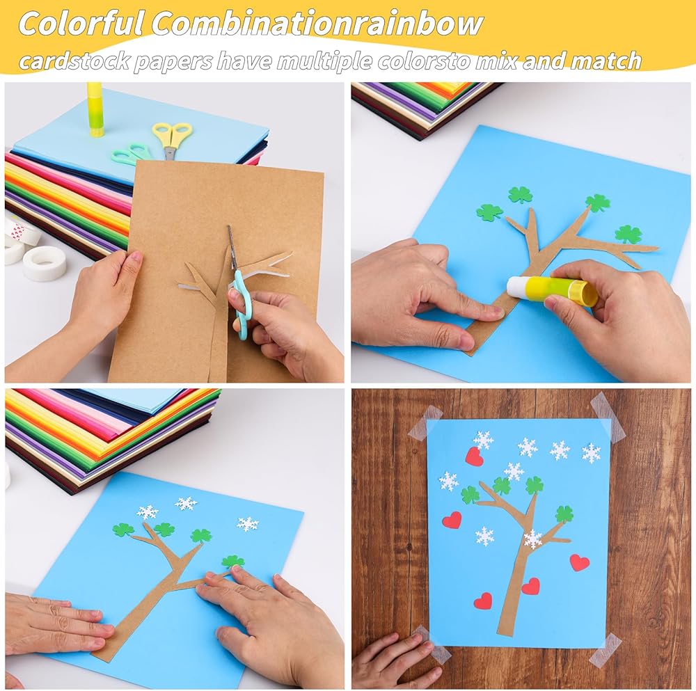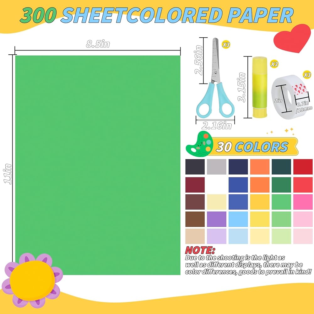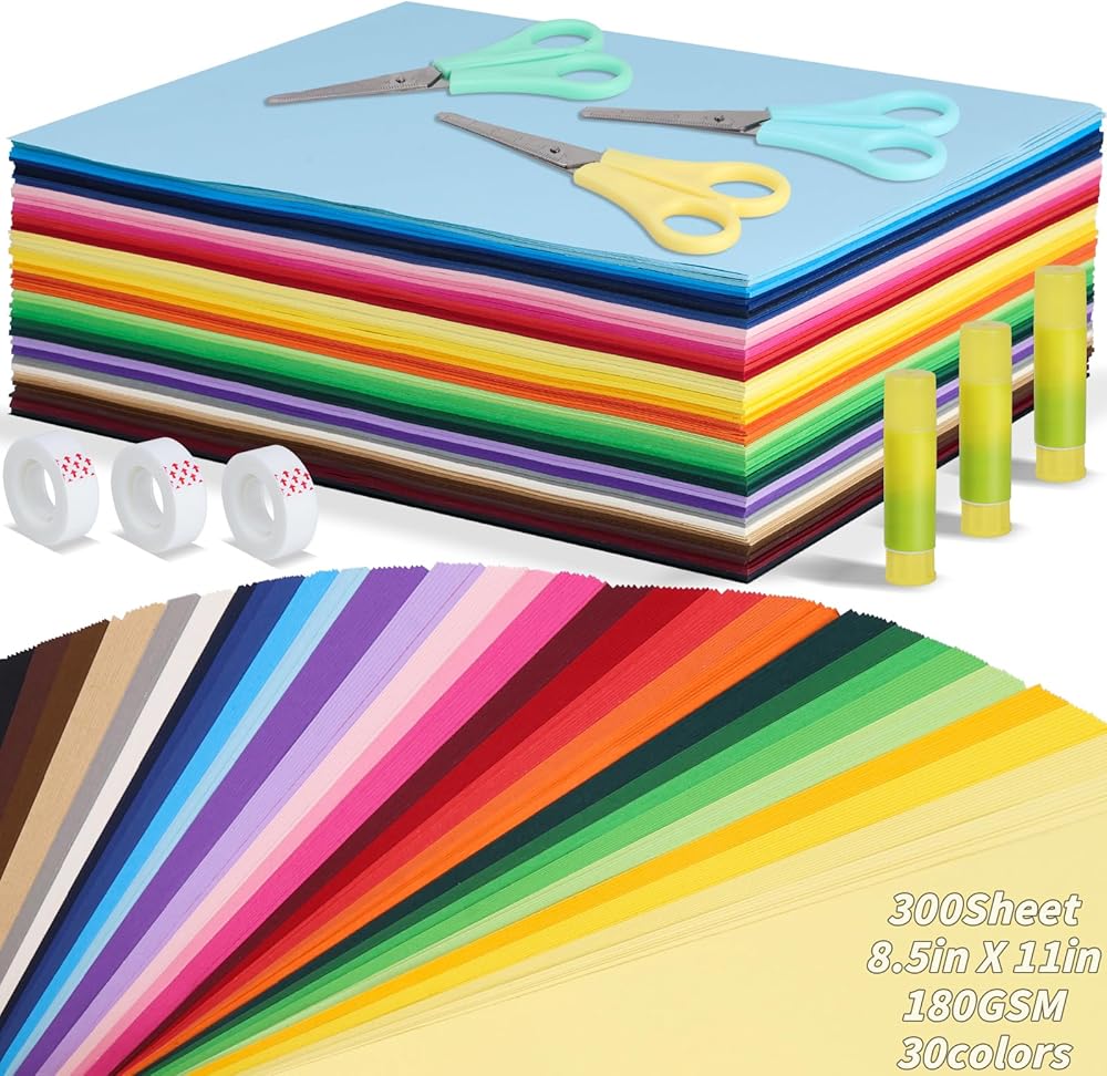 UZLU Colored Cardstock Sets: you will get 300 sheets 8.5" x 11" rainbow cardstock papers in 30 captivating shades, each color 10 sheets. In adddition, we are also equipped with 3 x kids glue sticks, 3 x blunt tip kids safety scissors random color, 3 x Transparent Tape. Multi colored paper set meet Your different demand for paper craft projects and for Easter, valentine, Halloween,Christmas Decor. this diy paper offers an extensive palette for your artistic endeavors