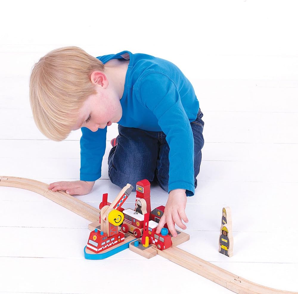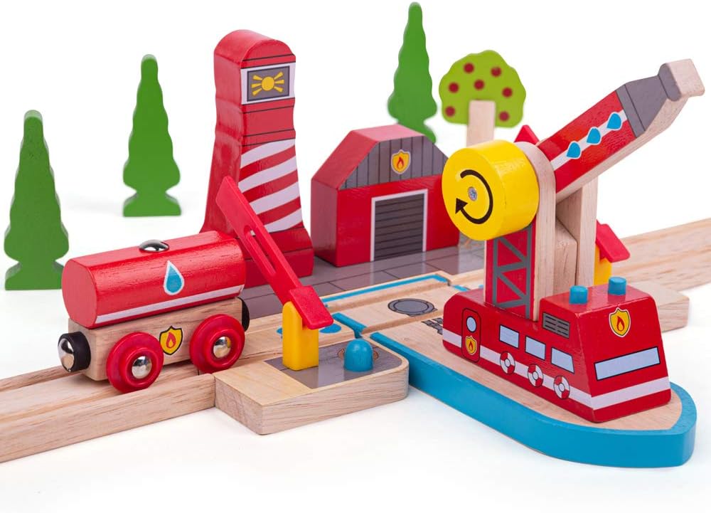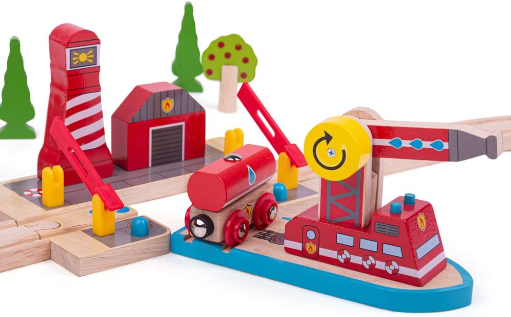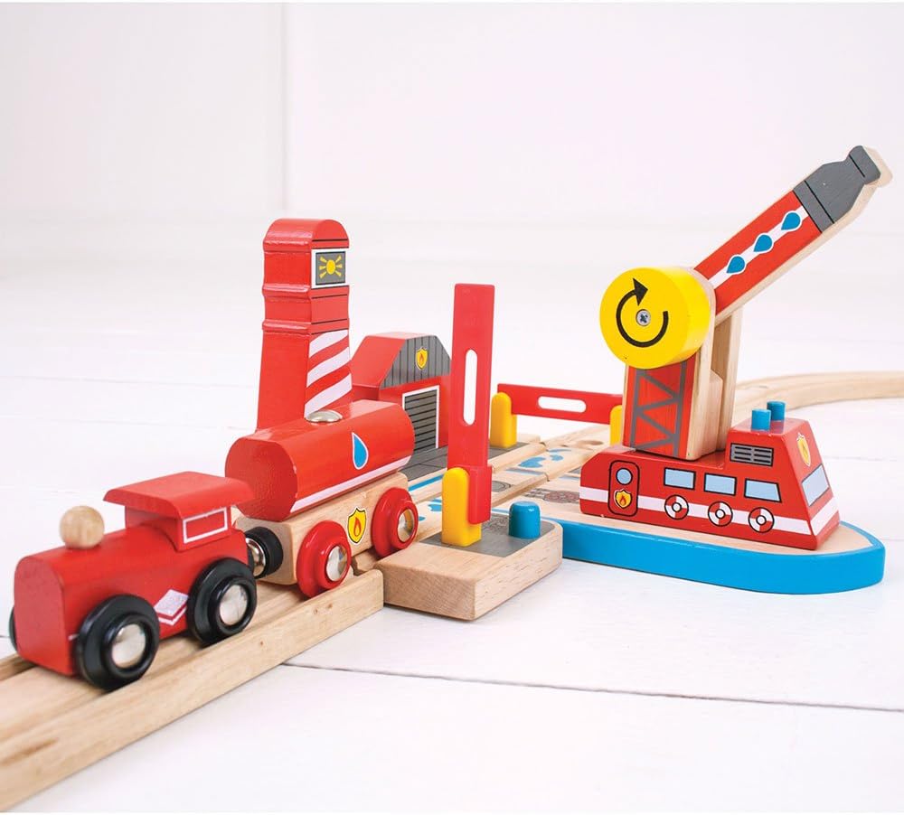 سكة Bigjigs، الإنقاذ من الحرائق والبحر، ألعاب خشبية، ملحقات قطار Bigjigs، ألعاب مركبات الإنقاذ، ألعاب القطار، رافعة خشبية لمجموعة القطار، ألعاب خشبية للأطفال من 3 إلى 4 5 سنوات