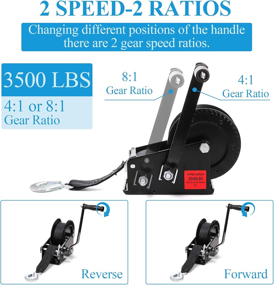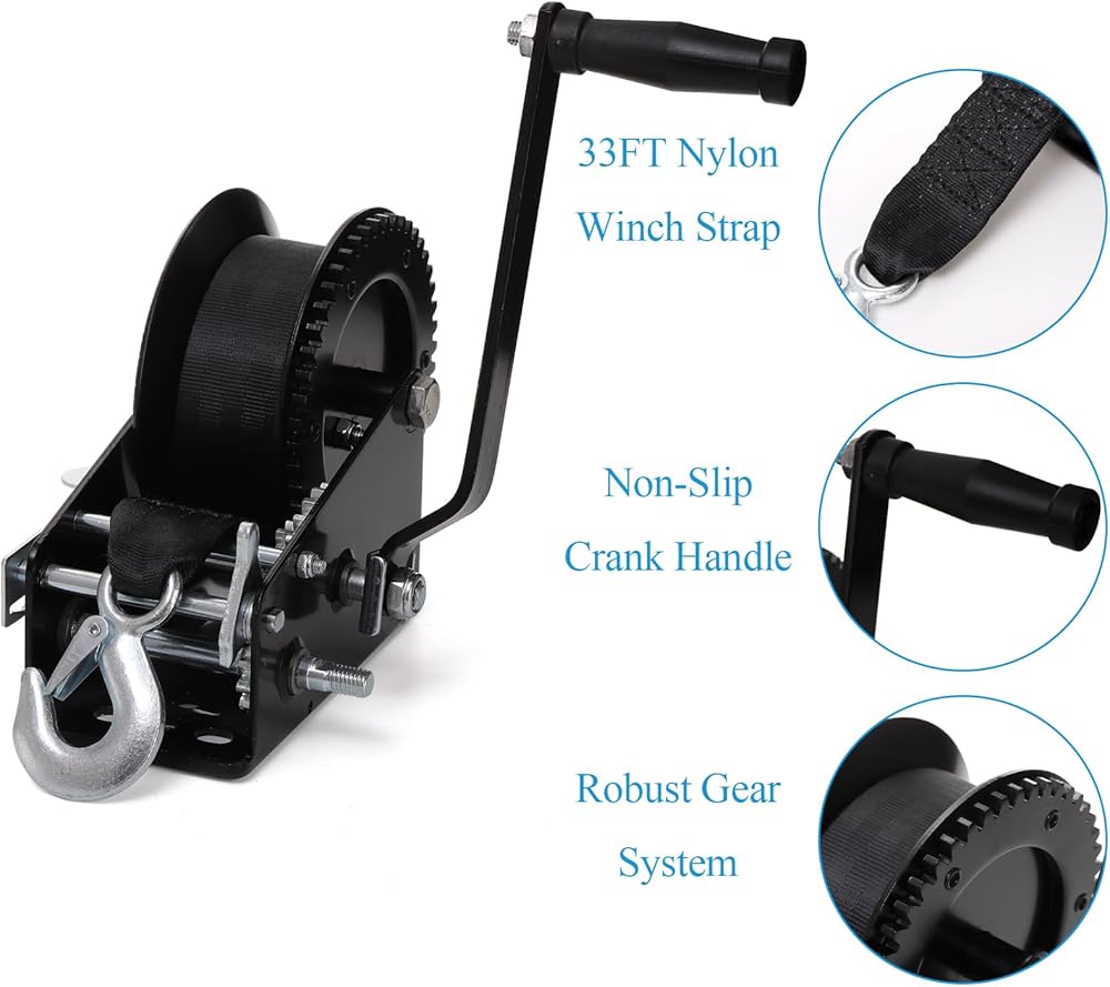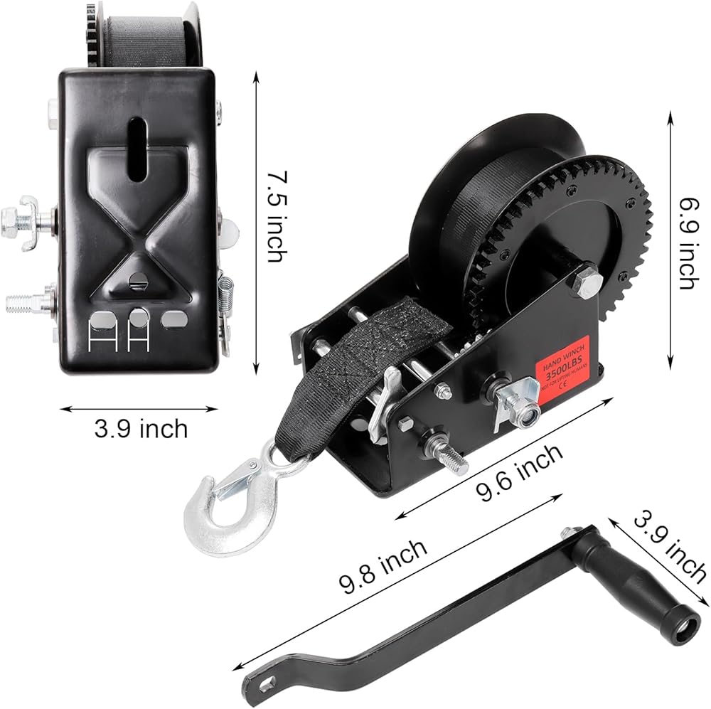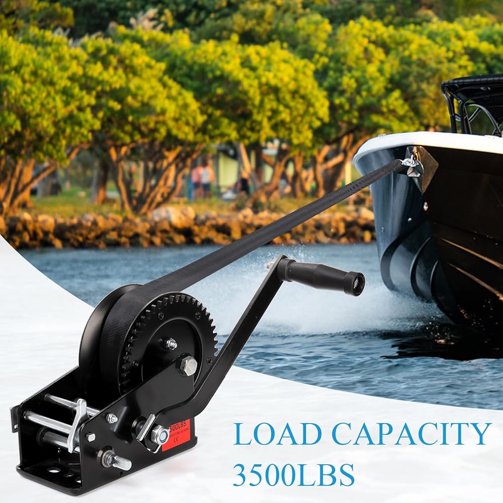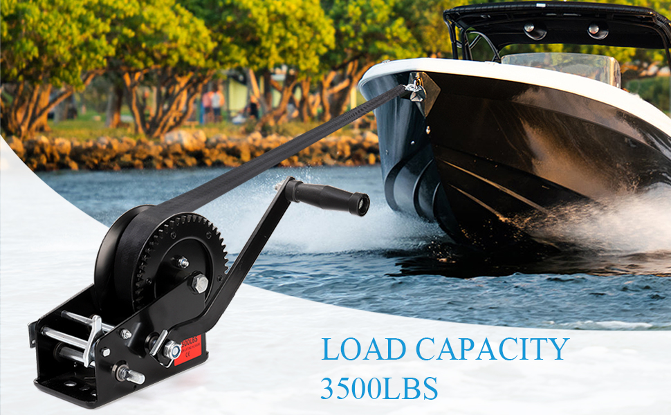 ونش يدوي 3500 رطل: تتميز ونش مقطورة القارب للخدمة الشاقة بقدرة ممتازة على رفع الحمولة وسحبها بقدرة سحب تبلغ 3500 رطل. يوفر حزام ونش القارب المصنوع من البوليستر الأسود بطول 33 قدمًا × عرض 5 سم مع خطاف سحبًا موثوقًا وآمنًا. حجم قاعدة التركيب: 7.5 بوصة × 3.93 بوصة.