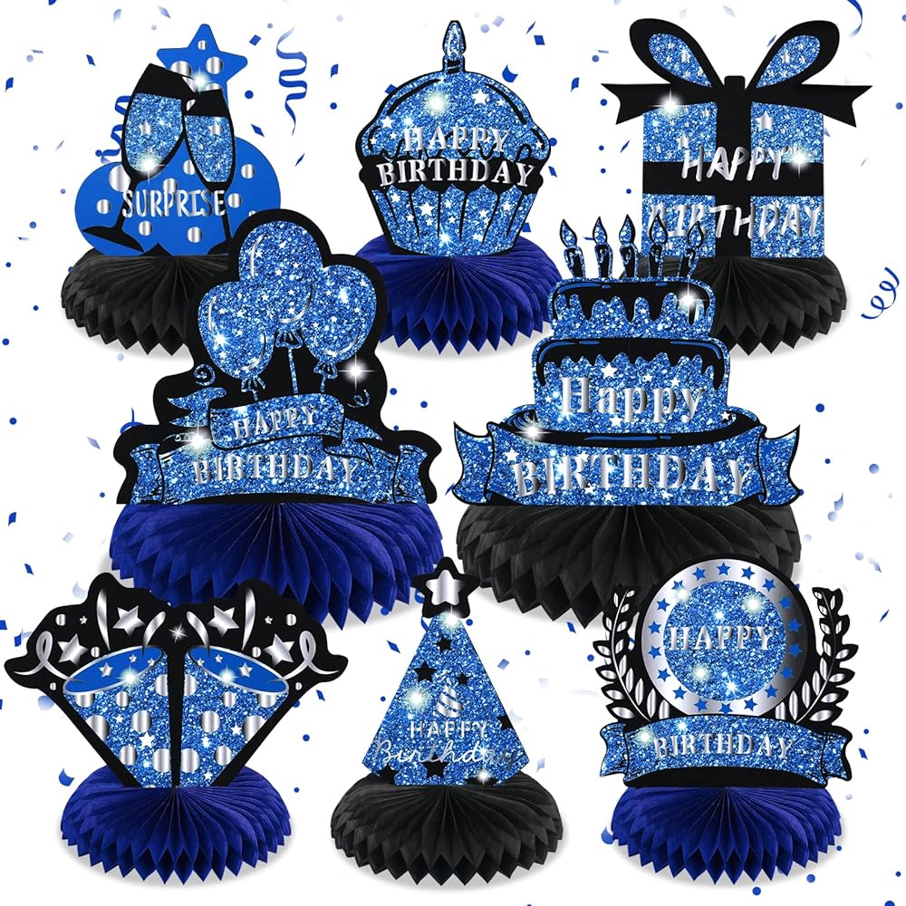 8 قطع من ديكورات الحفلات باللون الأزرق الداكن للرجال باللون الأزرق والفضي والأسود لقطع مركزية على شكل قرص العسل باللون الأزرق والفضي والأسود لعيد الميلاد وديكورات طاولة على شكل قرص العسل للرجال والنساء ومستلزمات حفلات أعياد الميلاد
