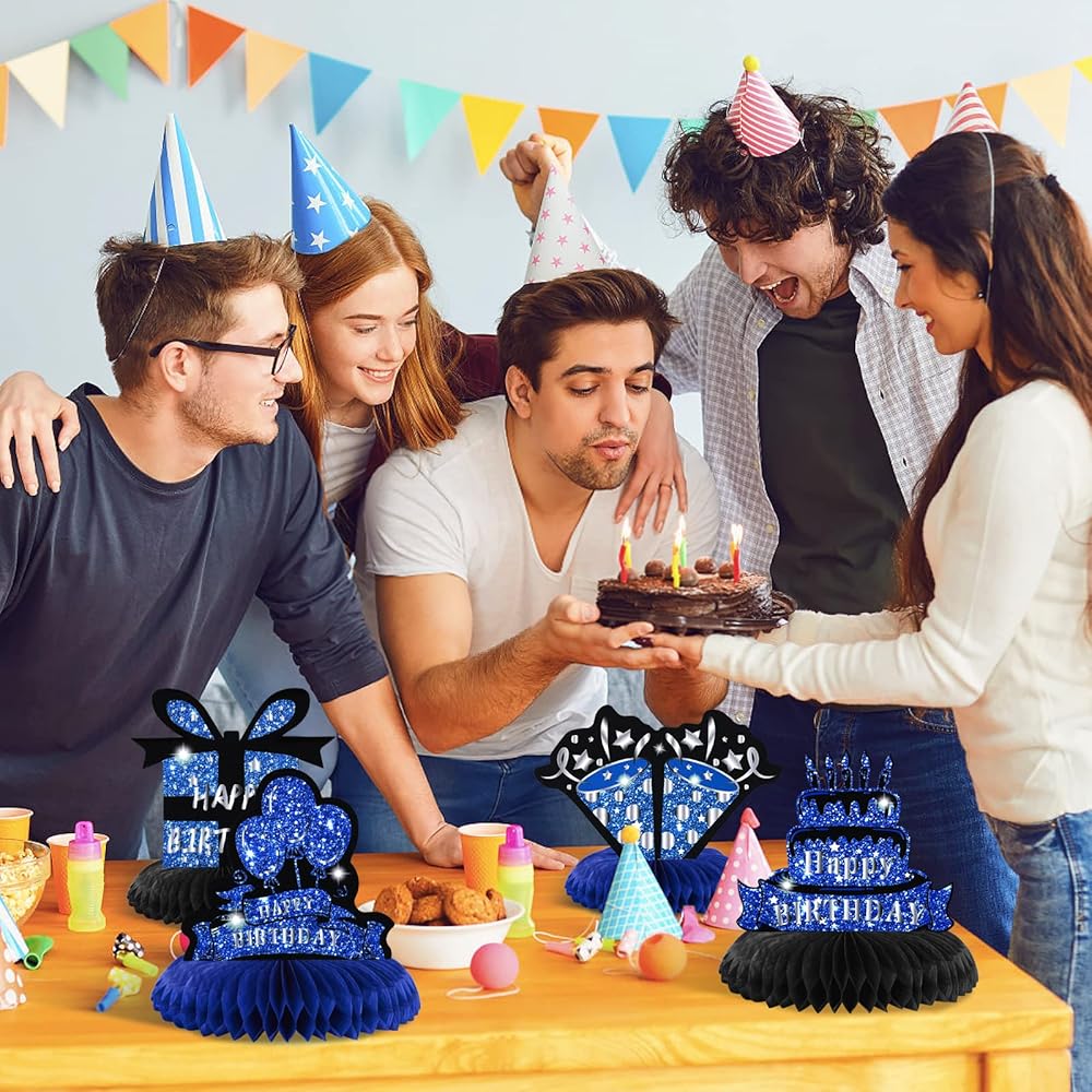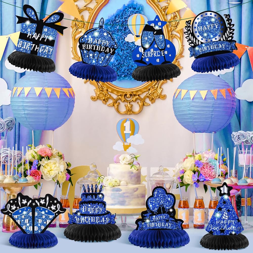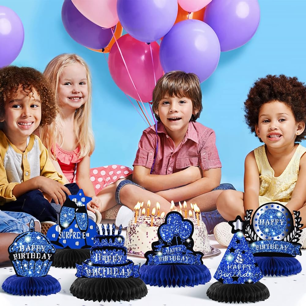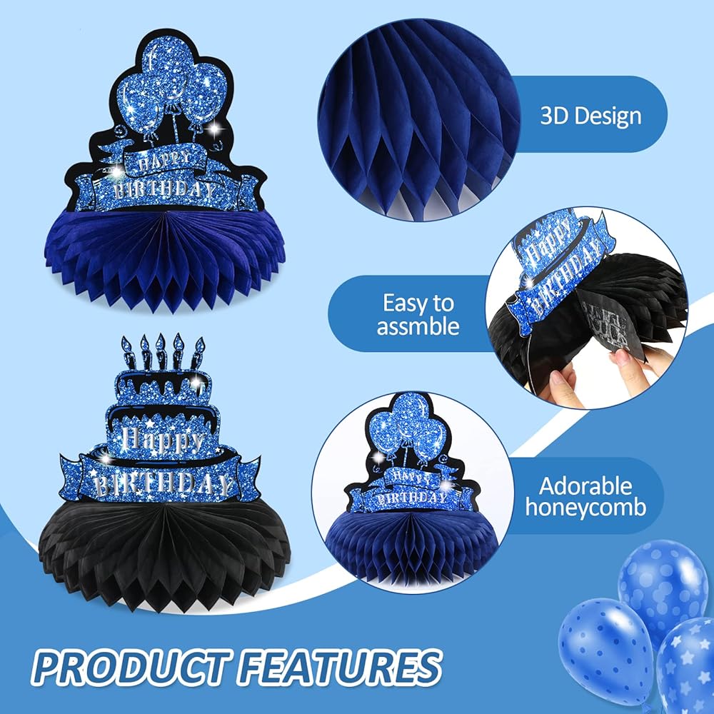 🎉【Blue Black Birthday Party Decoration】these blue black birthday birthday party supplies are combined with blue and black birthday element and 3D honeycomb table centerpieces design, create a delicate blue theme atmosphere for your birthday party, and leave a happy memory for everyone.