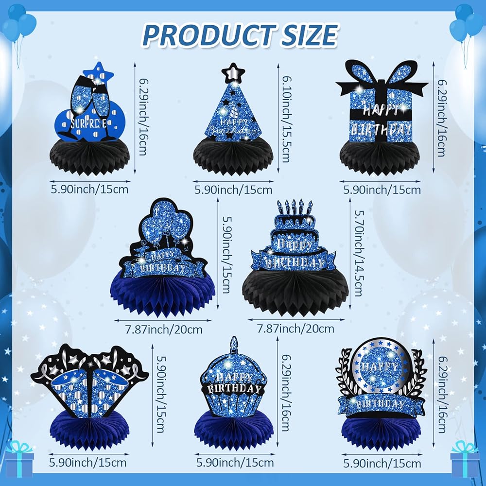 🎉【What You Will Get】:The package will come 8 pieces of Blue Black honeycomb centerpieces in different pattern designs, sufficient quantity and various styles to meet your party decoration needs.