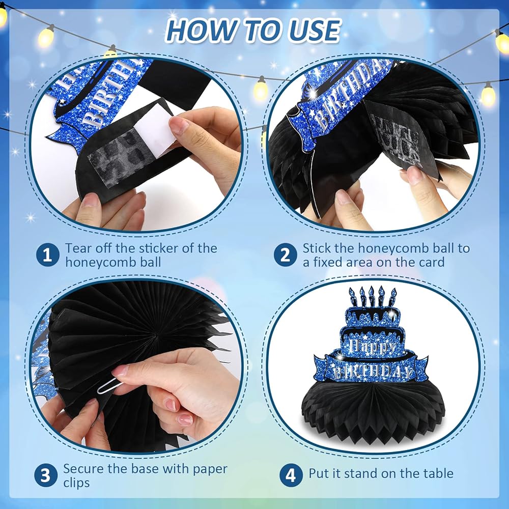 🎉【Easy to Assemble】Step1, tear off the sticker of blue black honeycomb centerpieces table decoration honeycomb ball. Step 2, stick the honeycomb ball to a fixed area on the card. Step 3, repeat on the other side of the card. Step 4,finally put it stand on the table. It's so easy that you can save a lot of time.