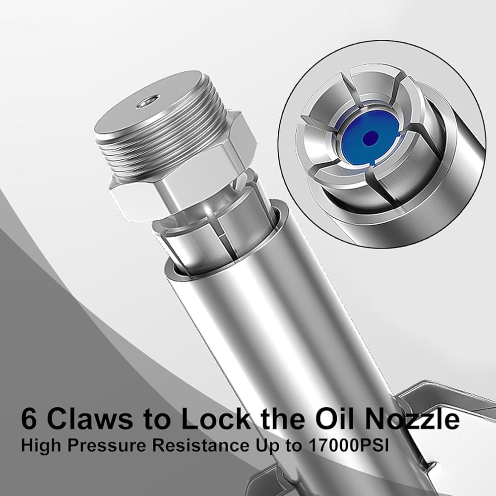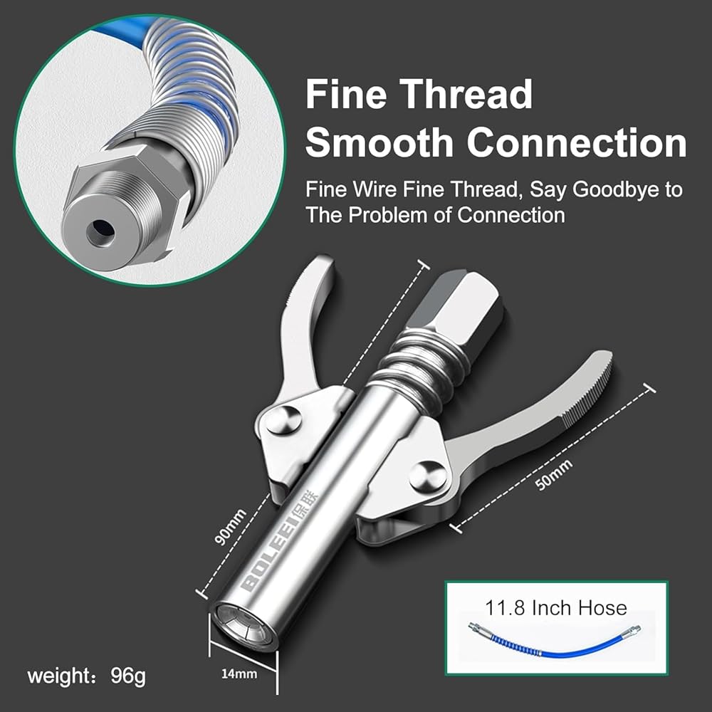 【مسدس شحم مانع للتسرب】 تتميز وصلة مسدس الشحوم بوظيفة قفل عض ناعمة وقوية بستة مخالب، مما يسمح بالتشغيل بيد واحدة، ولا حاجة إلى حمل مسدس الشحوم عند التشحيم، بعد قفل وصلة مسدس الشحوم، يمكنك تحريرها. كلتا يديه لتشغيل مسدس الشحوم.