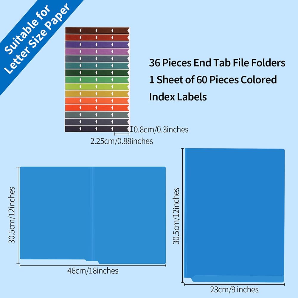 1.Abundant Quantity:The package contains 24 blue end tab file folders that can accommodate letter size files and a sheet of 60 colored index labels.The quantity is rich enough to meet your daily use needs.The index labels can help You can quickly classify all kinds of files.Regular filing keeps your desk and drawers clean.