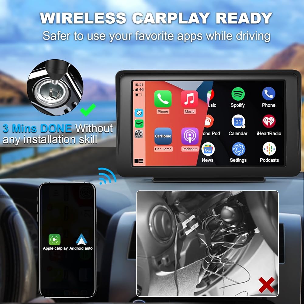 متوافق مع 99% من السيارات: تتوافق سيارة أبل المحمولة الخاصة بنا مع جميع السيارات أو الشاحنات من 12 إلى 24 فولت. إنه يناسب سيارتك تمامًا وهو أخف وزنًا وأكثر قابلية للحمل من ستيريو السيارة النموذجي. إذا كنت تستمتع بالسفر، فيمكنك أيضًا وضعها في حقيبة ظهرك واستخدامها لإضافة Apple CarPlay إلى أي سيارة عند استئجار واحدة في وجهتك. يعد ستيريو السيارة الذي يعمل بنظام Android Auto هو الرفيق المثالي للرحلة للملاحة.