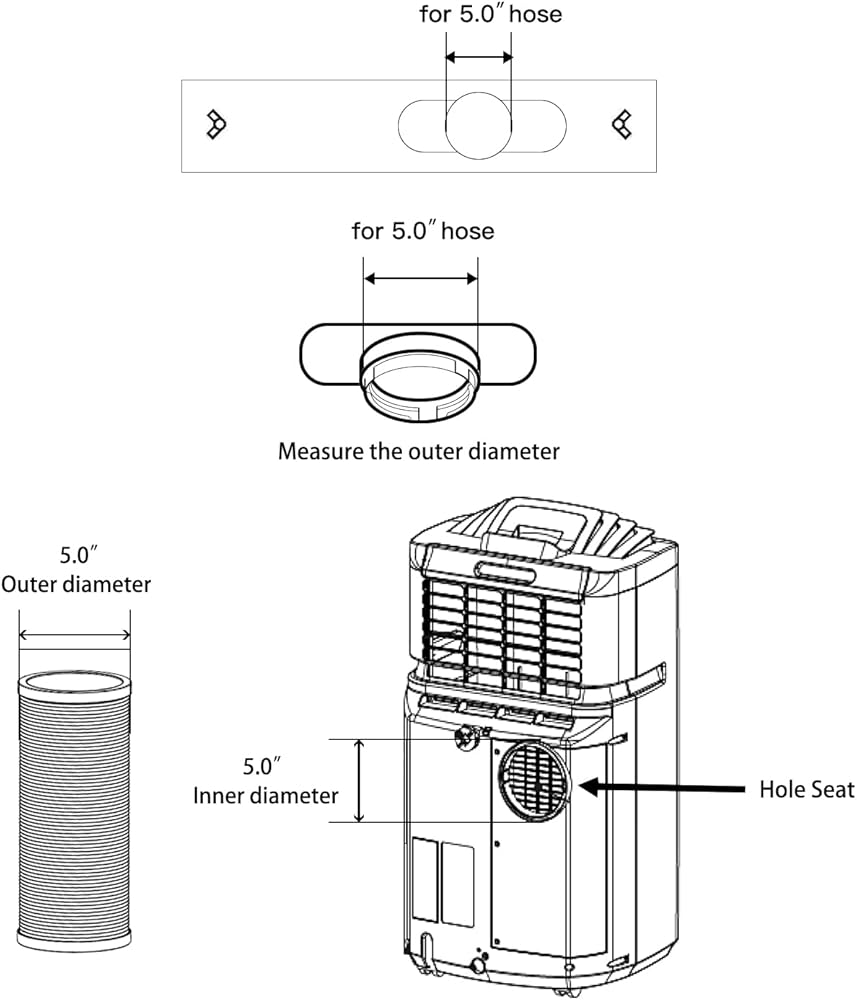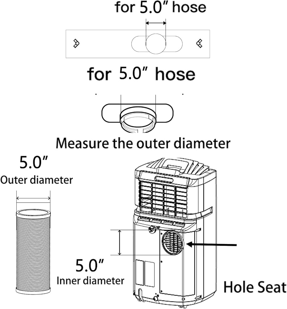 【التحقق من قطر المخرج】يرجى ملاحظة: مكيف الهواء المحمول يشتمل على مخرج عادم هواء في الجزء الخلفي من مكيف الهواء. يبلغ قطر فتحات خرطوم العادم 5.0 بوصة تقريبًا. لذا تأكد من التحقق من قطر منفذ مدخل هواء التيار المتردد والهواء مخرج العادم 5.0 بوصة قبل الشراء (الحافة الداخلية إلى الحافة الداخلية)