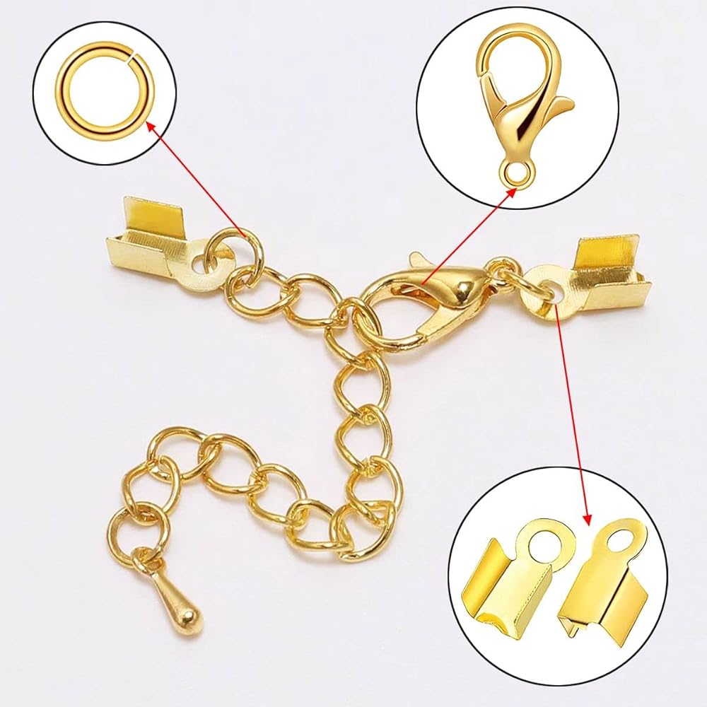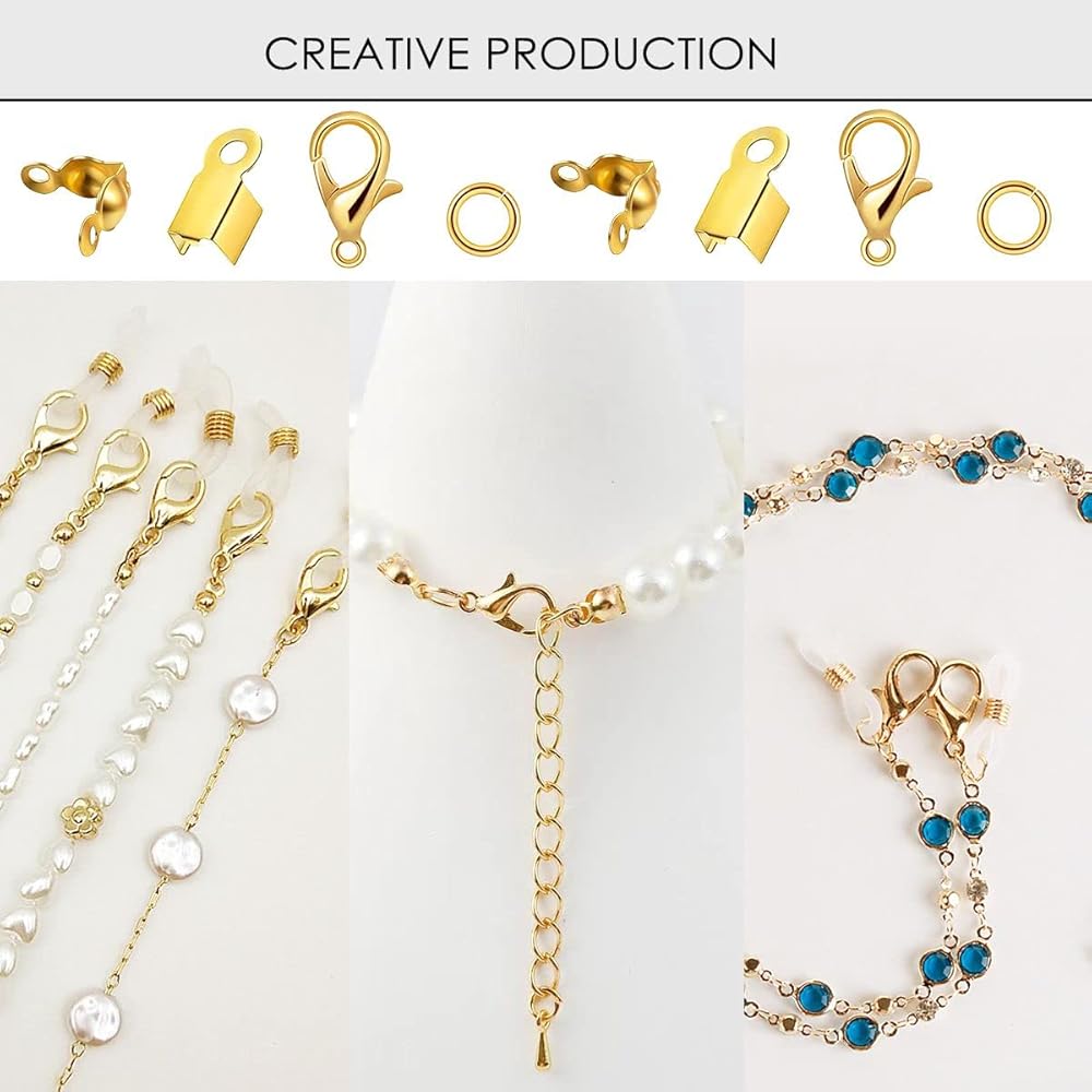 مجموعة إكسسوارات صناعة المجوهرات مكونة من 1400 قطعة مع 300 غطاء مجعد من الخرز، و400 غطاء طرفي قابل للطي، و500 حلقة قفز مفتوحة و200 مشبك مخلب جراد البحر، وأساور مستلزمات صناعة المجوهرات بنفسك (ذهبي)