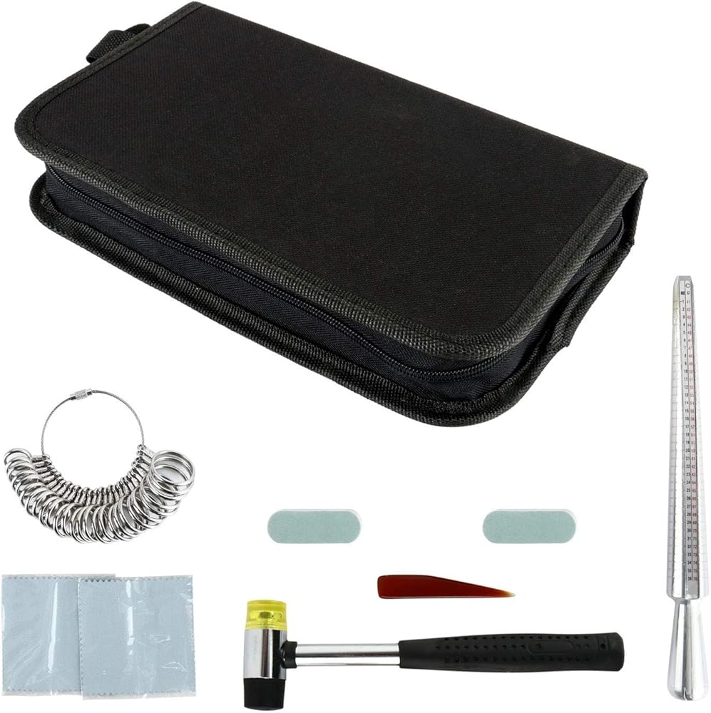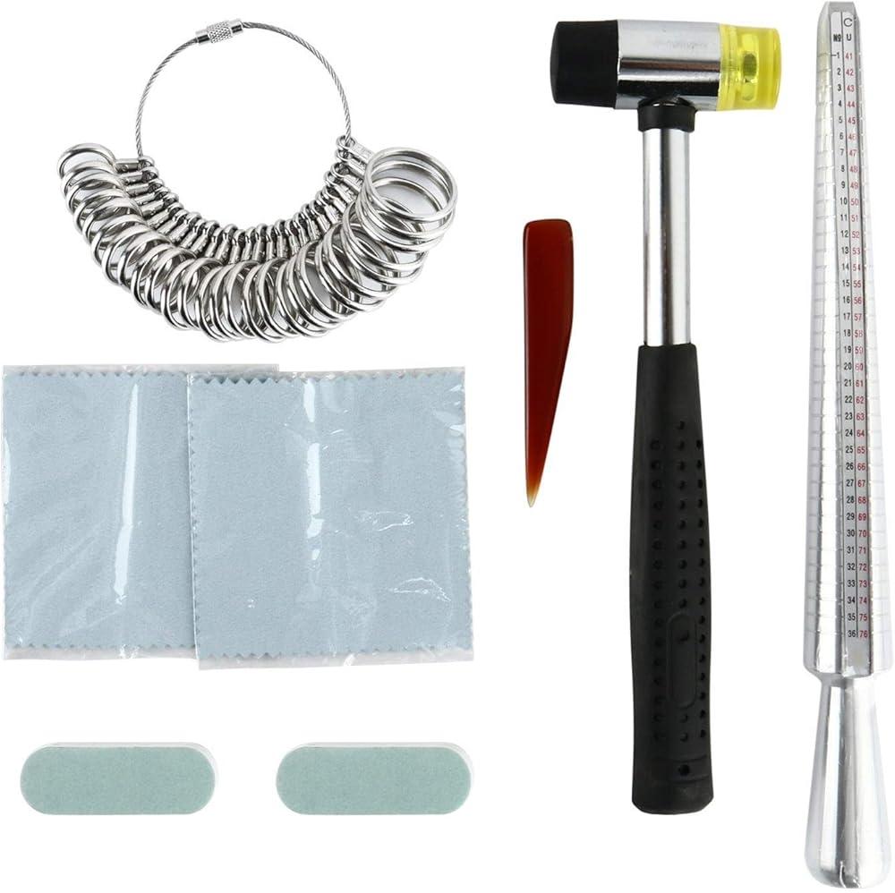 تتضمن العبوة: 1 × مغزل حلقي، 1 × مطرقة مطاطية، سلسلة من قياس الحلقة، 2 × قطعة قماش لتلميع المجوهرات، 2 × عصا تلميع، 1 × عقيق مصقول