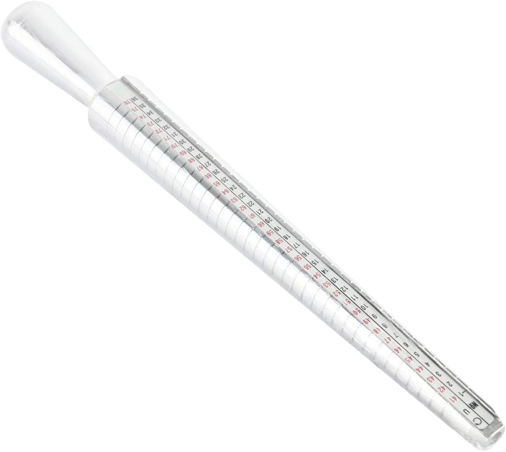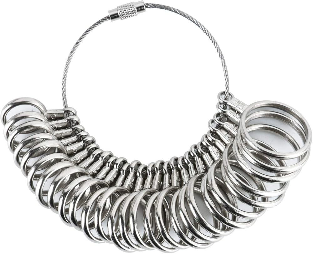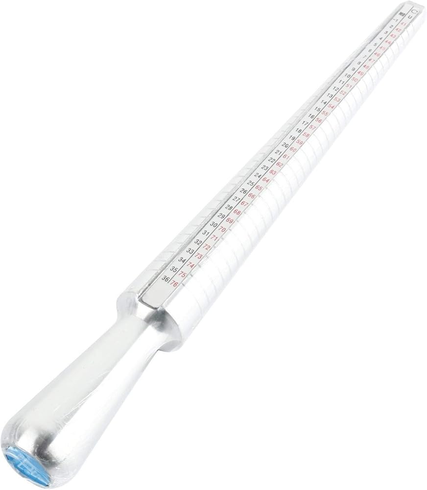 ممسك مقاس الحلقة مصنوع من مادة الألومنيوم، بمعايير الولايات المتحدة، جدول المقاسات سهل القراءة على المغزل للمقاسات الكاملة والنصف. مقياس حجم الحلقة هو المعيار الأمريكي: 0-13 مع زيادة الحجم يتم وضع علامة واضحة على كل حلقة