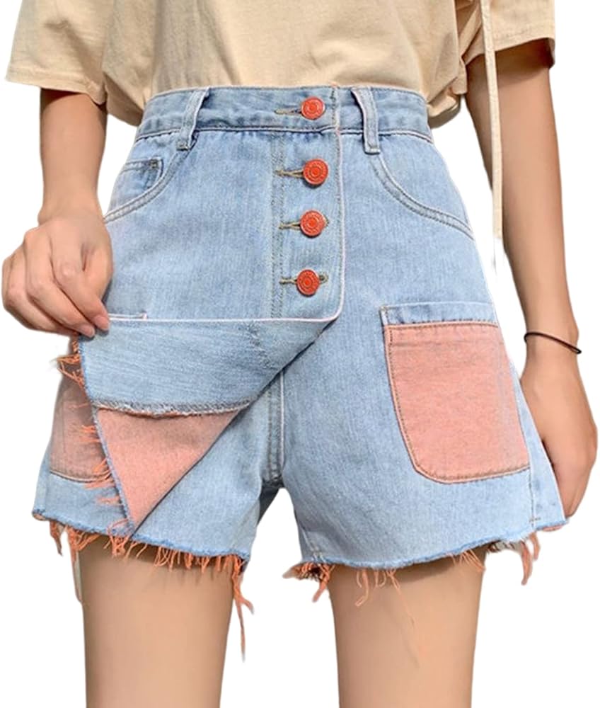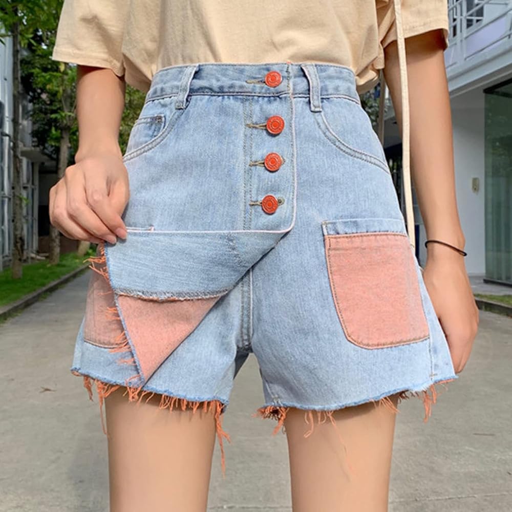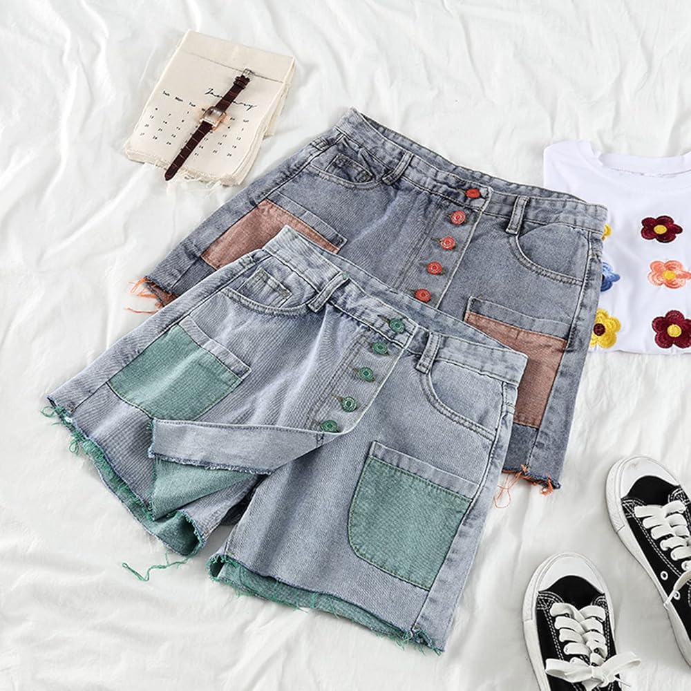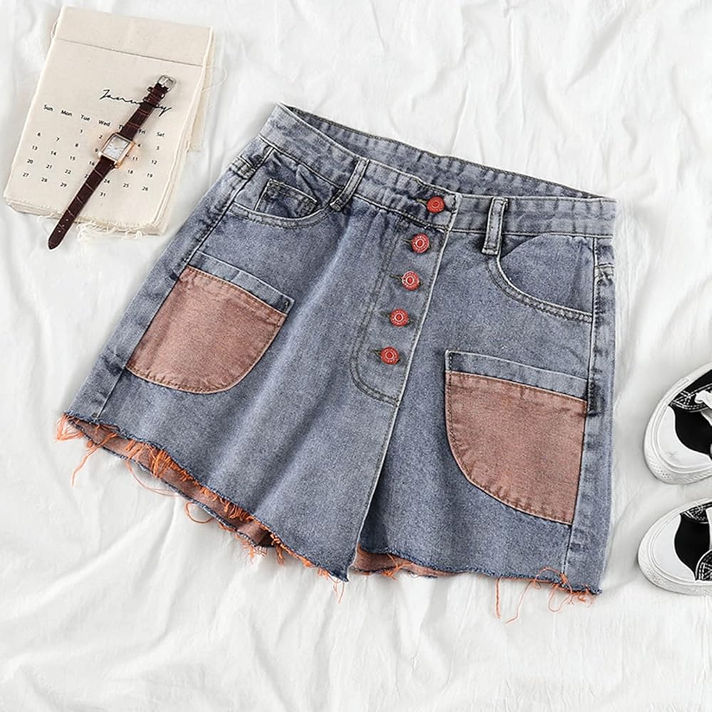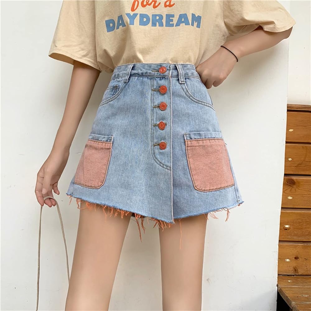 Women High Waist Vintage Button Front Denim Skort Shorts Summer Color Block Short Jeans with Pockets