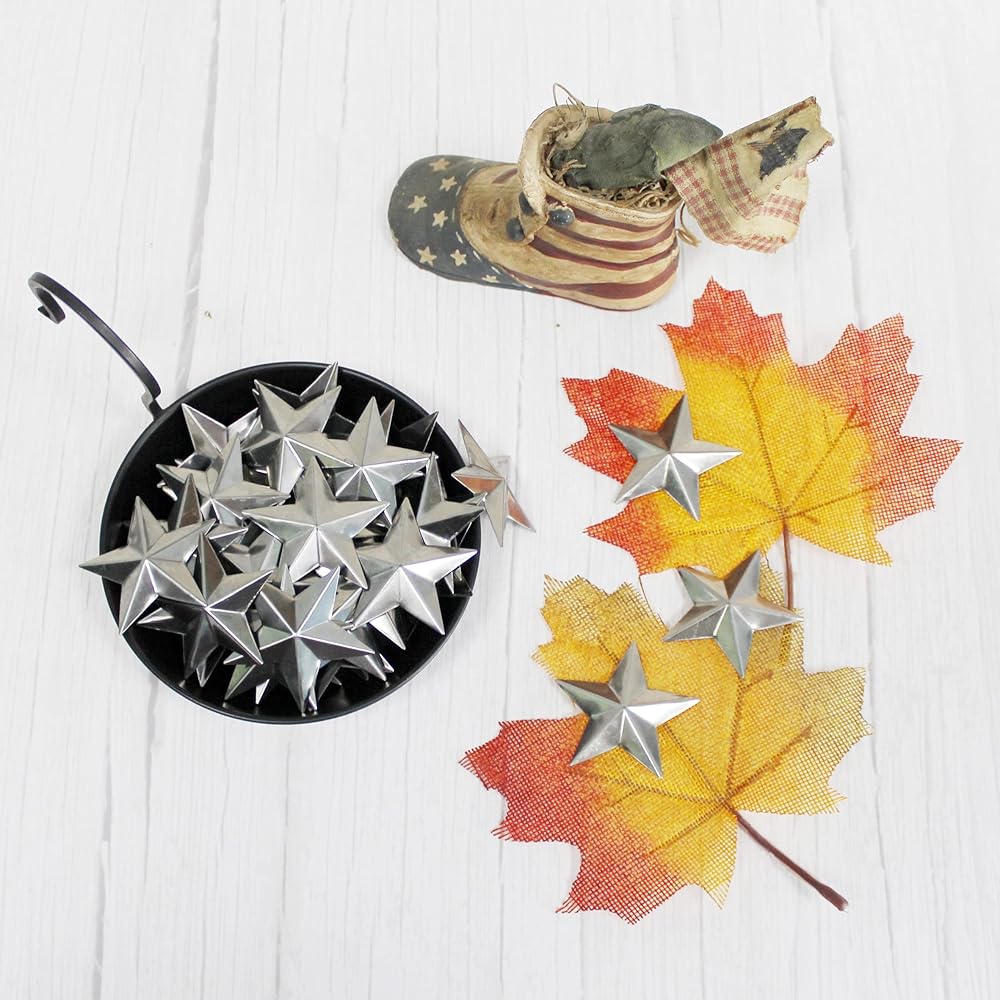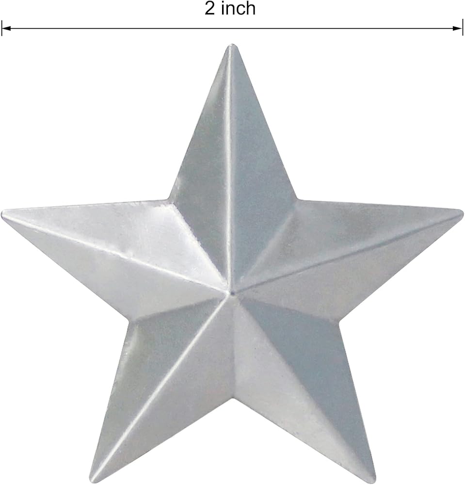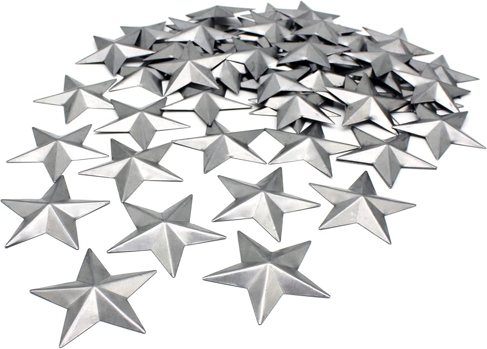 • Size is 2 inch, 55 PCS in a Set. Made of galvanized metal with farmhouse silver finish, no hole on the stars.