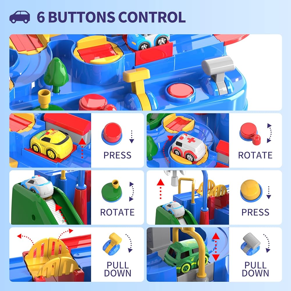 【مجموعة اللعب الإبداعية التي يتم تشغيلها يدويًا】 - لعبة مغامرة إنقاذ سيارة البناء هذه مجهزة بـ 4 سيارات صغيرة و6 أزرار للتحكم في 8 تحديات مختلفة وتمريرها. بالمقارنة مع مسار السيارة التقليدي الفردي، فإن مجموعة ألعاب مغامرات السيارة 2 في 1 أكثر متعة وأكثر قابلية للعب ومناسبة للألعاب التعاونية. ألعاب مسار السيارة للأولاد بعمر 3 4 5 6 سنوات.