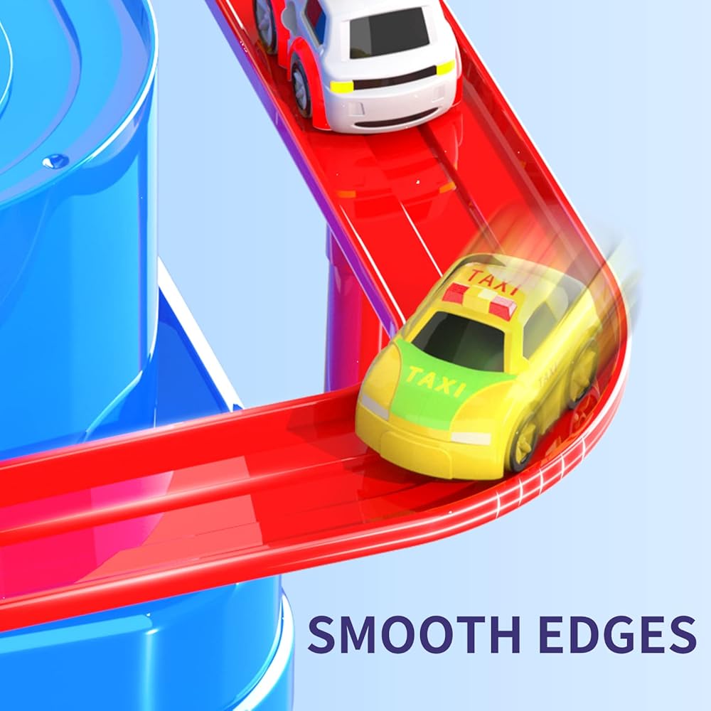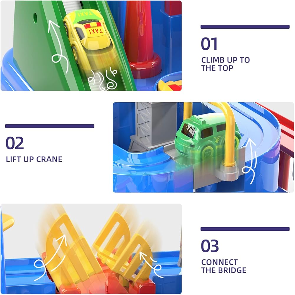 【لا تحتاج إلى بطارية 】- مسار ربط ميكانيكي مدمج، سكة حديدية للمركبة بالقصور الذاتي، لا حاجة إلى بطاريات. الهيكل المادي المستقر يجعل المنتج أقوى ولا يمكن تدميره بسهولة. ألعاب مسار السيارة للأطفال الصغار 3-5 5-7.