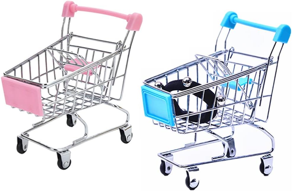 عربة يد سوبر ماركت صغيرة مكونة من قطعتين، عربة تسوق صغيرة، عربة تسوق سوبر ماركت، عربة تسوق، حامل ألعاب تخزين مكتبي (وردي وأزرق فاتح)