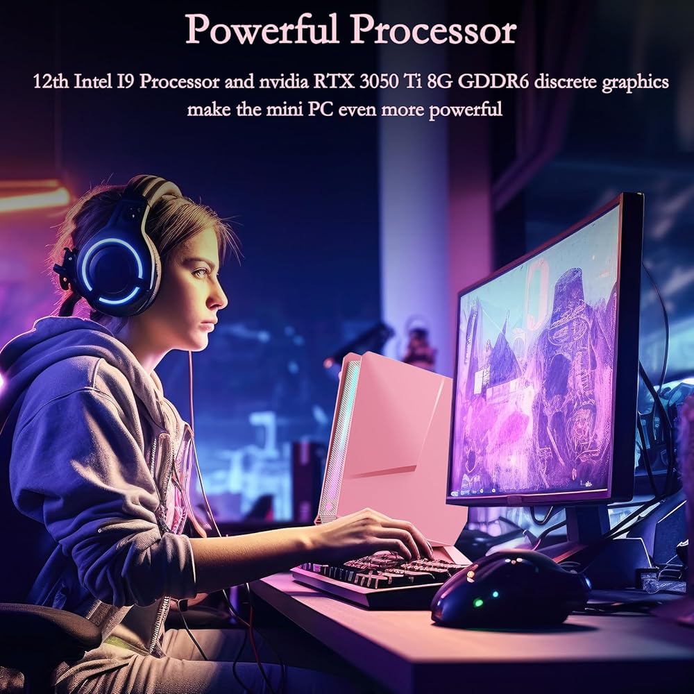 Geforce RTX Card - The pink Mini PC is built in Geforce RTX 3050 Ti 8GB GDDR6 Video Card and 2560 CUDA Cores, it powers the world's fastest GPUs, enjoy beautiful ray tracing, AI-powered DLSS, and much more in games and applications! which is the ultimate platform for gamers and creators.