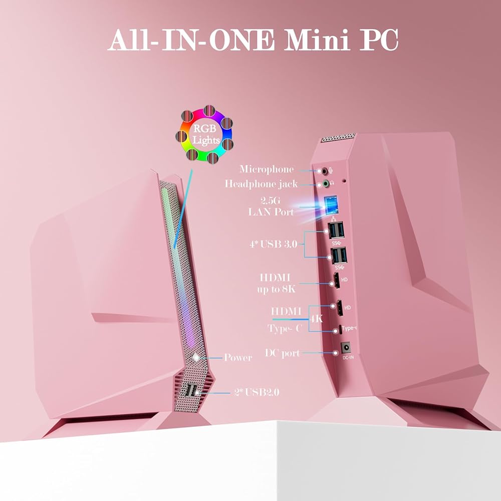 High Cooling with Twin Turbo Smart Fan and copper module Heat Spreader, mini computer sound under 38 dB. Pink - Pick Up Your Teenage Dreams, the Mini PC features RGB lighting with the ability to display a rainbow of seven colors for a very beautiful and Cool color effect.