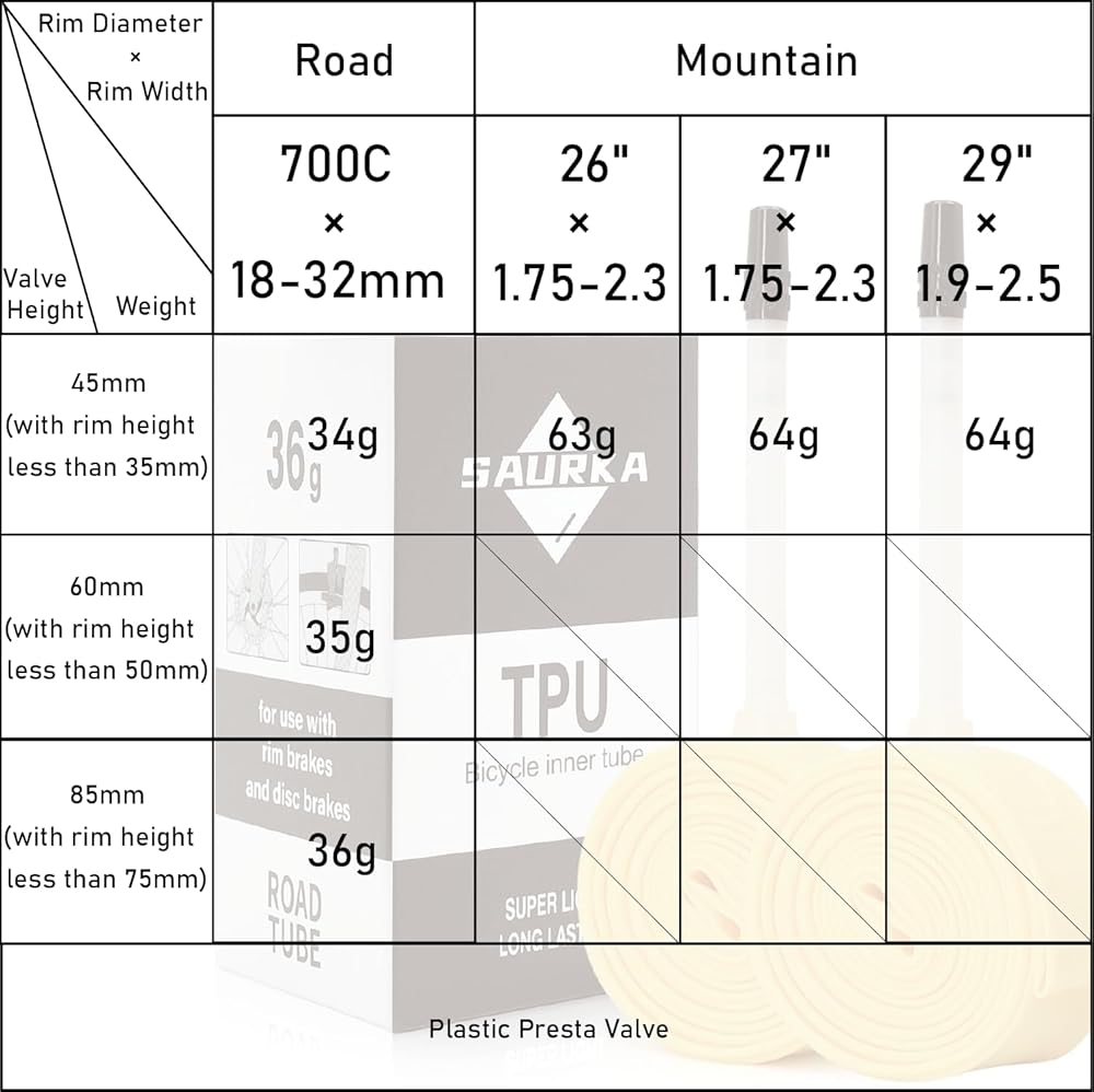 • 【التوافق: هذا الأنبوب الداخلي المصنوع من مادة TPU يمكن أن يناسب دراجات الطرق بأحجام الإطارات المختلفة، بما في ذلك 18/23/25/28 30/32c. يرجى الطلب دون قلق.