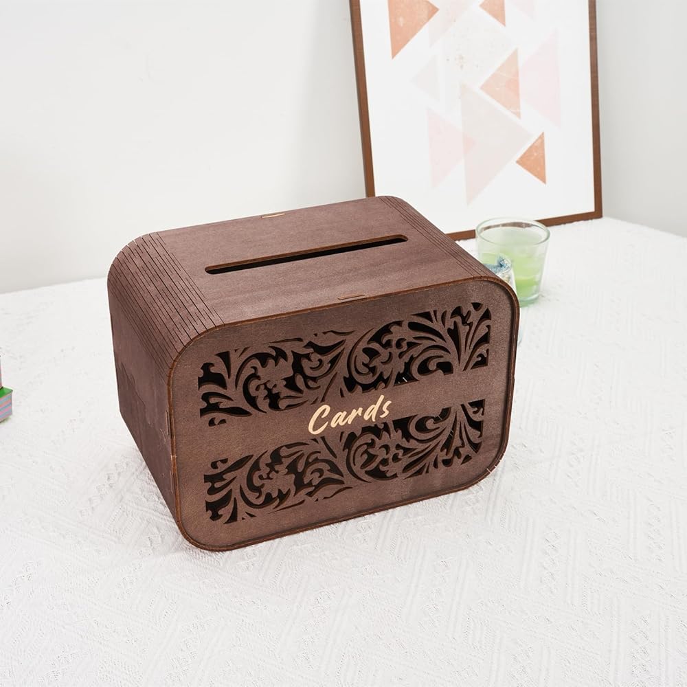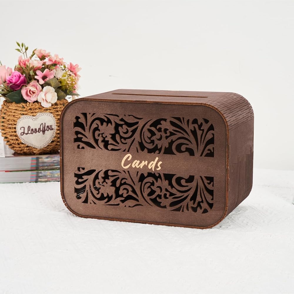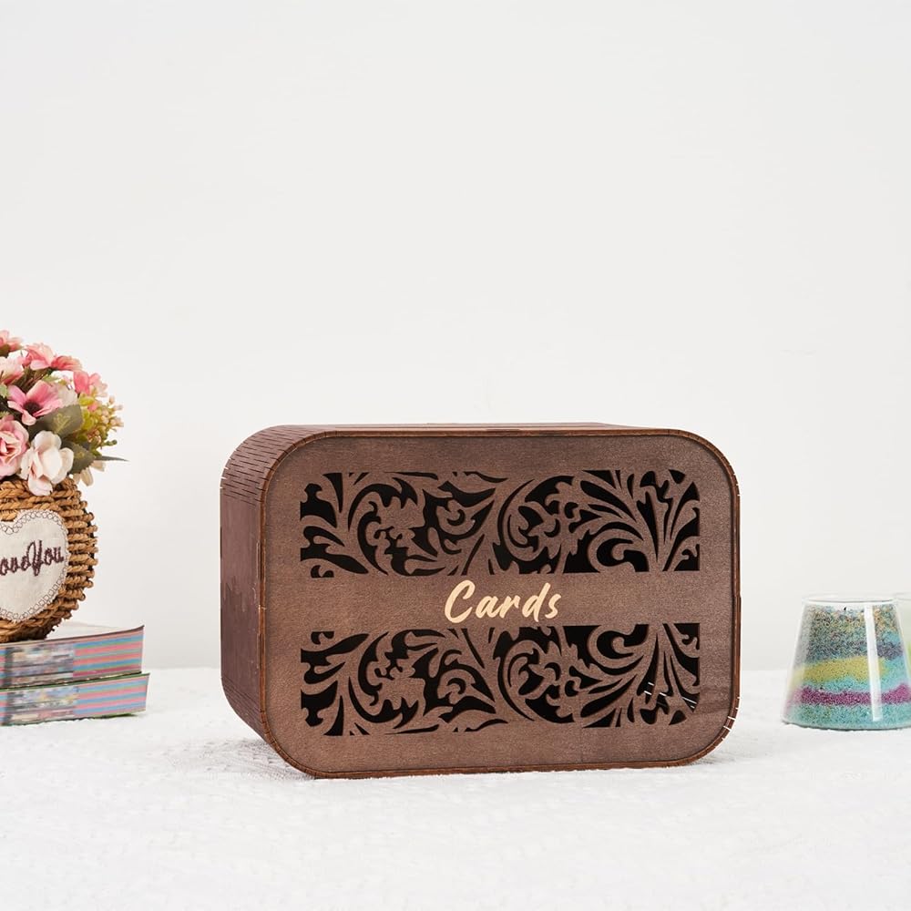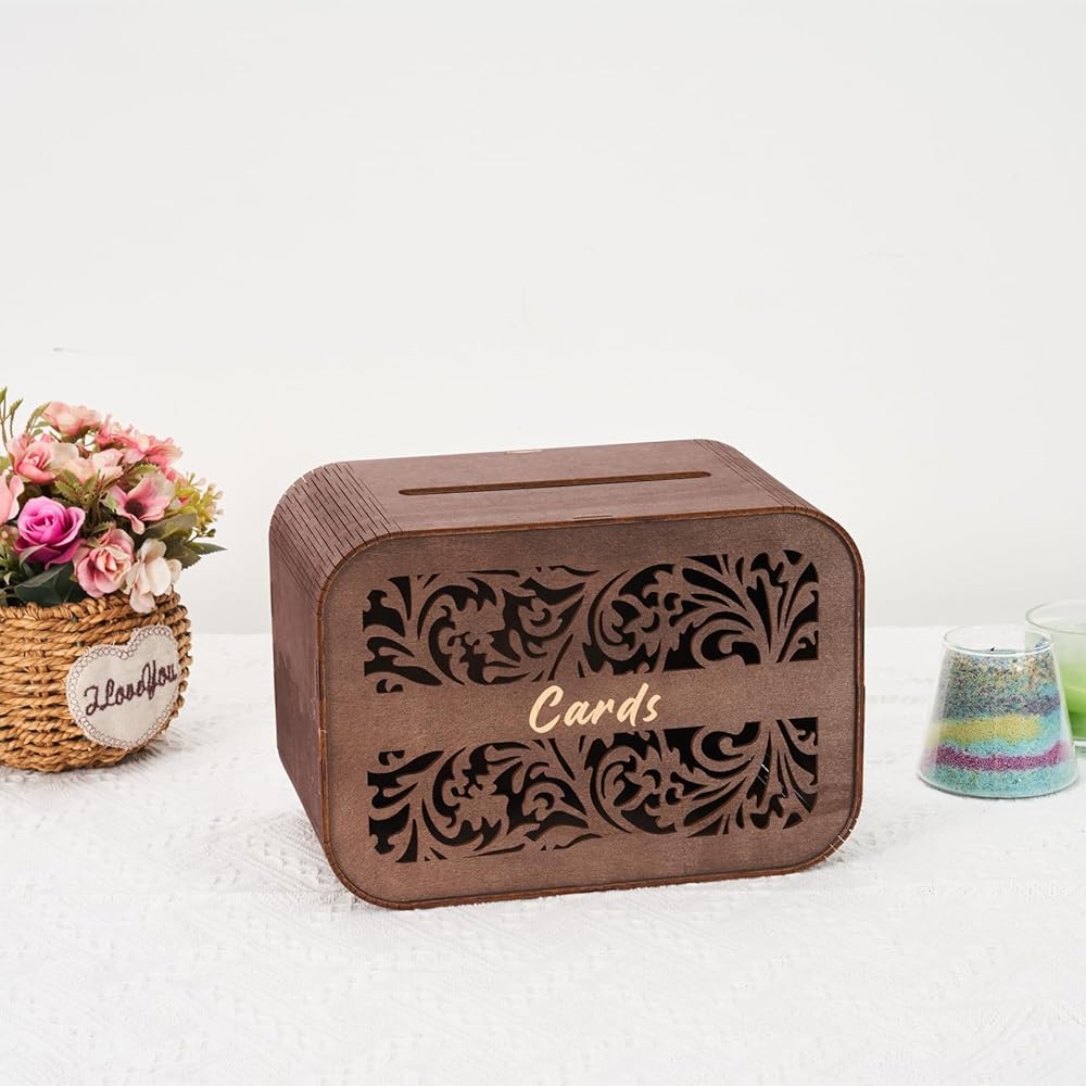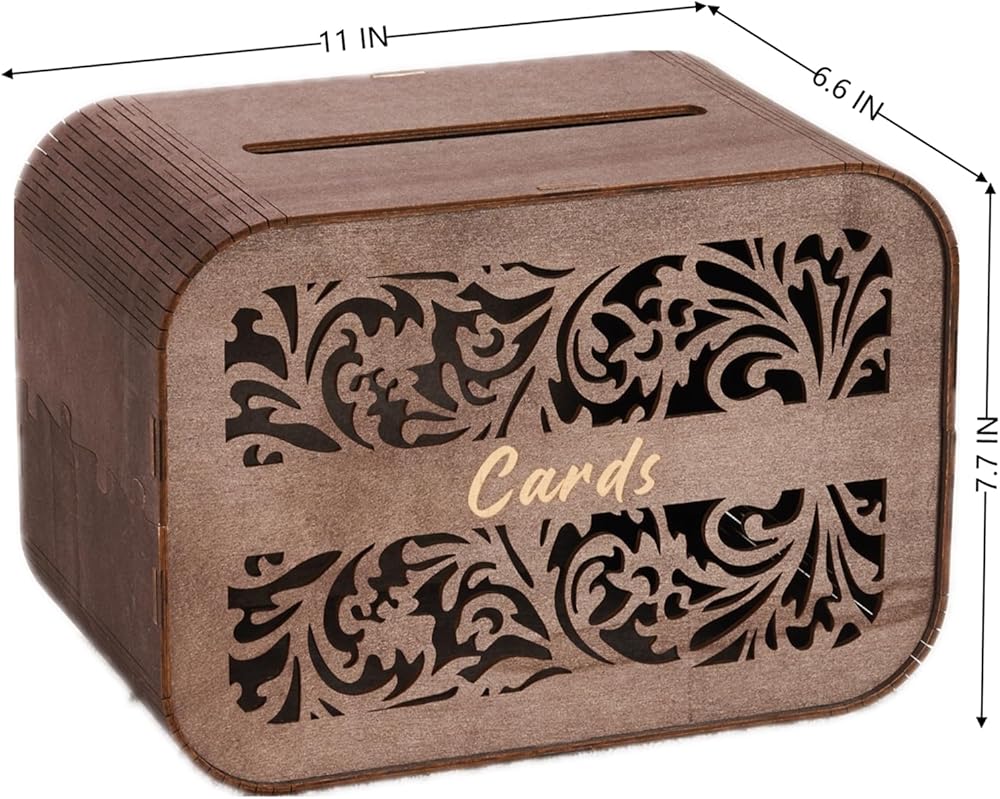 • 【المقاس】 يبلغ مقاس حامل صندوق بطاقات الزفاف 11.5 طولًا × 6.6 عرضًا × 7.7 ارتفاعًا، ويمكنه حمل حوالي 50-100 بطاقة، وهو خيار جيد لوضعه على طاولة التوقيع أو القطعة المركزية للحفلات كمجموعة بطاقات وتزيين مكان الزفاف.