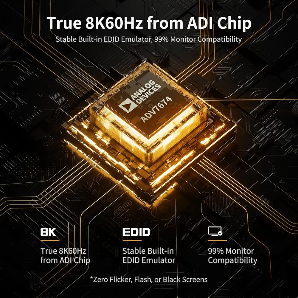【محاكيات Ultra HD 8K@60هرتز وEDID】الدقة تصل إلى 8K(4320p)@60هرتز، 4K(2160p)@60هرتز/120هرتز/144هرتز باستخدام تقنية DSC ومتوافقة مع الأسفل، تدعم 3D، HDR10، HDCP2.2، وDolby الرؤية تقدم المزيد من مقاطع الفيديو الرائعة والأصلية على شاشتك. باستخدام محاكيات EDID في كل منفذ إدخال، تتلقى أجهزة الكمبيوتر لديك دائمًا معلومات العرض الصحيحة وتمنع تغيير إعدادات العرض أثناء تبديل المدخلات. يحررك من متاعب ضبط إعدادات العرض باستمرار.